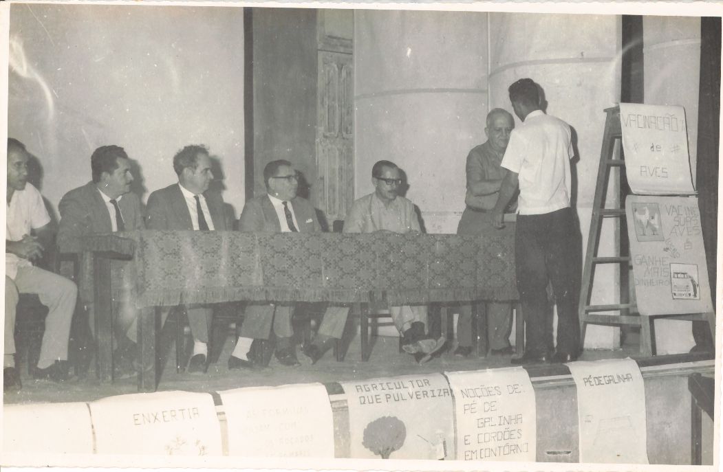Continuação da solenidade de outorga de certificados do Treinamento de Aluno Instrutor para o Projeto Euclides da Cunha, realizada no Colégio Agrícola Dom Agostinho Ikas – Codai, em São Lourenço da Mata. Como não possui uma data especificada adotamos o ano de 1971 como a data em que foi registrada. Na fotografia, observa-se que o evento aconteceu em um auditório, onde aparece acima do público, sobre uma espécie de tablado, a mesa de das autoridades. Registra o momento em que o professor Almir Pires Ferreira, encontra-se de pé, entregando o certificado a um aluno concluinte do Treinamento. Enquanto isso, sentados à mesa vê-se da esquerda para a direita da fotografia, os professores Paulo Barretto Campello, Luiz de Góes Vieira, Júlio Fernandes, o professor Isaias Vasconcelos e o professor não identificado. É possível ver uma série de cartazes colados na base do tablado, assim como na escada que se encontra localizada no lado direito da fotografia. Durante a entrevista para rememoração, ao observar a fotografia, o reitor Adierson falou: “Hum! Que maravilha essas fotografias... Nos faz reviver esses momentos do nosso passado profissional...Como disse, esses professores eram os responsáveis pelas respectivas disciplinas do curso. Repito que reconheço Paulo BarretoCampello, Luiz de Góes Vieira, Júlio Fernandes, Isaias Vasconcelos... Esse quinto aqui sei quem era, mas não lembro o nome e esse último era Almir Pires Ferreira. Parabéns, por esse importante trabalho que vocês estão realizando!!!!”. FONTES DE PESQUISA: Entrevista concedida às bibliotecárias Conceição Martins e Vania Ferreira para atender aos objetivos do Repositório Institucional, projeto “(Re) Memórias da UFRPE”, para a contextualização das imagens do acervo fotográfico do reitorado do Prof. Dr. Adierson Erasmo de Azevedo, no período de dezembro de 1969 a agosto de 1973. Acervo localizado no Núcleo do Conhecimento Professor João Baptista Oliveira dos Santos, da Biblioteca Central da UFRPE. Entrevista realizada no dia 04 de maio de 2016, no setor de Normalização da Biblioteca Central da UFRPE. Duração de 2h32min22seg. com transcrição e pesquisa complementar da bibliotecária Conceição Martins.