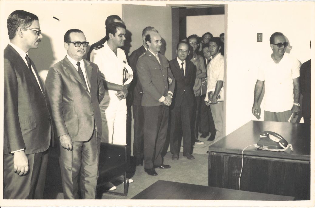 Registra o momento de uma inauguração cujo local e o ano não foram identificados. Diante disso, colocou-se como data aproximada o ano de 1970. Durante a entrevista para rememoração, o reitor Adierson falou: “Infelizmente, não tenho como lembrar porque foram muitas inaugurações... (Observando)... Desculpem, mas minha memória não ajuda.” FONTES DE PESQUISA: Entrevista concedida às bibliotecárias Conceição Martins e Vania Ferreira para atender aos objetivos do Repositório Institucional, projeto “(Re) Memórias da UFRPE”, para a contextualização das imagens do acervo fotográfico do reitorado do Prof. Dr. Adierson Erasmo de Azevedo, no período de dezembro de 1969 a agosto de 1973. Acervo localizado no Núcleo do Conhecimento Professor João Baptista Oliveira dos Santos, da Biblioteca Central da UFRPE. Entrevista realizada no dia 27 de abril de 2016, no Espaço Santander da Biblioteca Central da UFRPE. Duração de 2h17min com transcrição e pesquisa complementar da bibliotecária Conceição Martins.