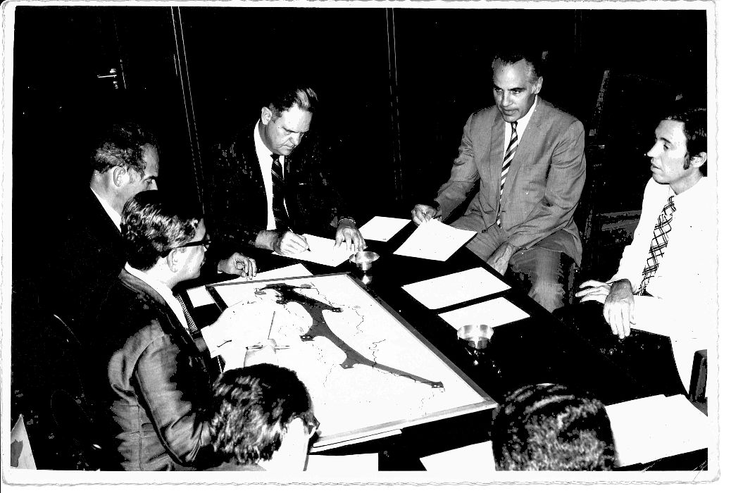 Fotografia que captou a continuação da reunião registrada também na fotografia 14, vendo-se o reitor Adierson diante dos professores Júlio Fernandes do Curso de Medicina Veterinária e do professor Evaldo Cisne Azevedo do Curso de Química, bem como de mais 04 autoridades em torno de uma mesa, sobre a qual encontram-se o mapa de Pernambuco com o gráfico do Projeto da Interiorização da UFRPE para Garanhuns e outros documentos. Nela, o fotografo conseguiu captar o instante exato da realidade em que houve o movimento de mãos da autoridade sentada à cabeceira da mesa que cruzou o braço esquerdo sobre o direito enquanto escrevia, bem como captou a mudança dos olhares e das posturas dos presentes. Durante a entrevista para contextualização, o ex-reitor Adierson, não conseguiu lembrar os nomes dessas autoridades. FONTES DE PESQUISA: Entrevista concedida às bibliotecárias Conceição Martins e Vania Ferreira para atender aos objetivos do Repositório Institucional, projeto “(Re) Memórias da UFRPE”, para a contextualização das imagens do acervo fotográfico do reitorado do Prof. Dr. Adierson Erasmo de Azevedo, no período de dezembro de 1969 a agosto de 1973. Acervo localizado no Núcleo do Conhecimento Professor João Baptista Oliveira dos Santos , da Biblioteca Central da UFRPE. Entrevista realizada no dia 13 de abril de 2016, no Espaço Santander da Biblioteca Central da UFRPE. Duração de 2h40min com transcrição e pesquisa complementar da bibliotecária Conceição Martins. AZEVEDO, Adierson Erasmo de. A “Caminhada seguindo o Sol” da Universidade Federal Rural de Pernambuco. Recife: Editora UFRPE, 2007.