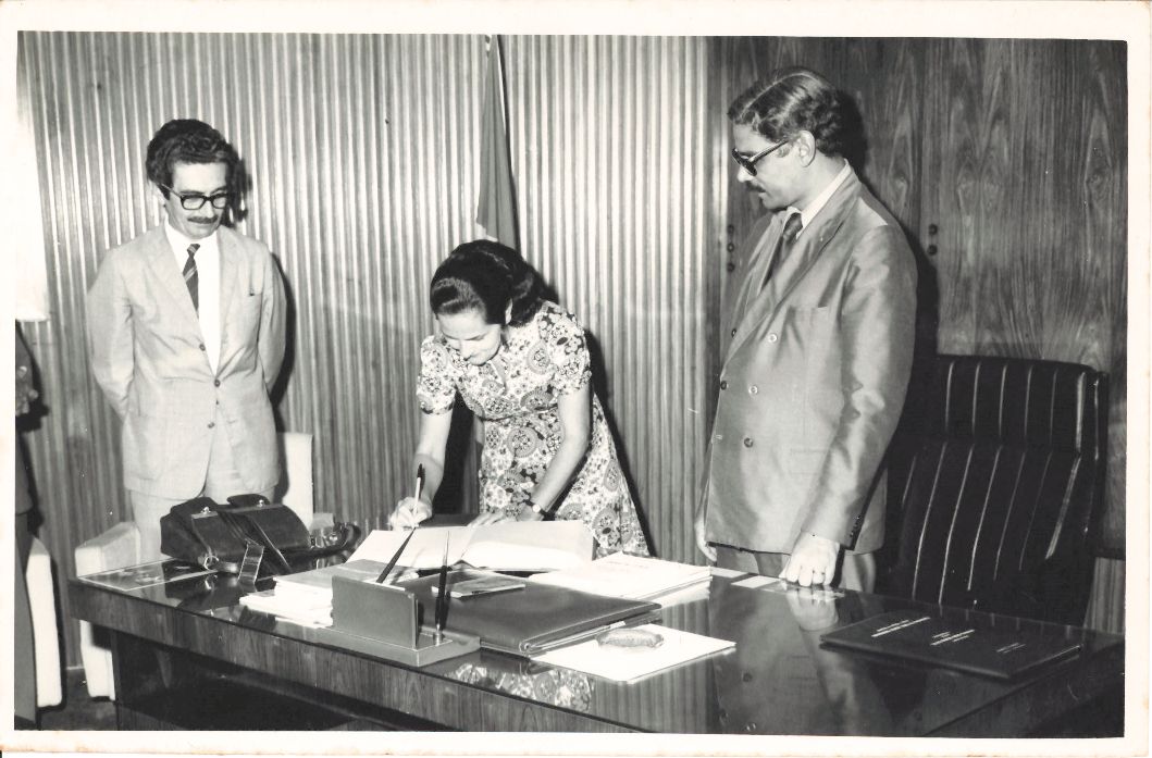 Click da continuação da Posse da professora Carmy Coutinho de Araújo como diretora do Centro de Formação e Treinamento de Professores Agrícolas – CFTPA, no gabinete da reitoria da UFRPE, na qual se vê o professor Adierson Erasmo de Azevedo, reitor da UFRPE, de pé, diante do bureau observando a professora assinando o Livro de Atas. À esquerda da foto, encontra-se o bacharel Apulcro de Menezes, chefe de gabinete da reitoria também observando a mencionada assinatura. Durante a entrevista para rememoração, ao observar a fotografia, o reitor Adierson falou: “Ah! Começo a lembrar... O sobrenome dela era Coutinho? .... Ela estava assinando sua posse no Livro de Atas, aqui está Apulcro... (Observando...) Não lembro bem...” FONTES DE PESQUISA: Entrevista concedida às bibliotecárias Conceição Martins e Vania Ferreira para atender aos objetivos do Repositório Institucional, projeto “(Re) Memórias da UFRPE”, para a contextualização das imagens do acervo fotográfico do reitorado do Prof. Dr. Adierson Erasmo de Azevedo, no período de dezembro de 1969 a agosto de 1973. Acervo localizado no Núcleo do Conhecimento Professor João Baptista Oliveira dos Santos, da Biblioteca Central da UFRPE. Entrevista realizada no dia 27 de abril de 2016, no Espaço Santander da Biblioteca Central da UFRPE. Duração de 2h17min com transcrição e pesquisa complementar da bibliotecária Conceição Martins. PESQUISA COMPLEMENTAR: UFRPE. Relatório Atividades administrativas da Universidade Federal Rural de Pernambuco, exercício de 1972. Recife: Imprensa Universitária da UFRPE, 1973. 41 p.