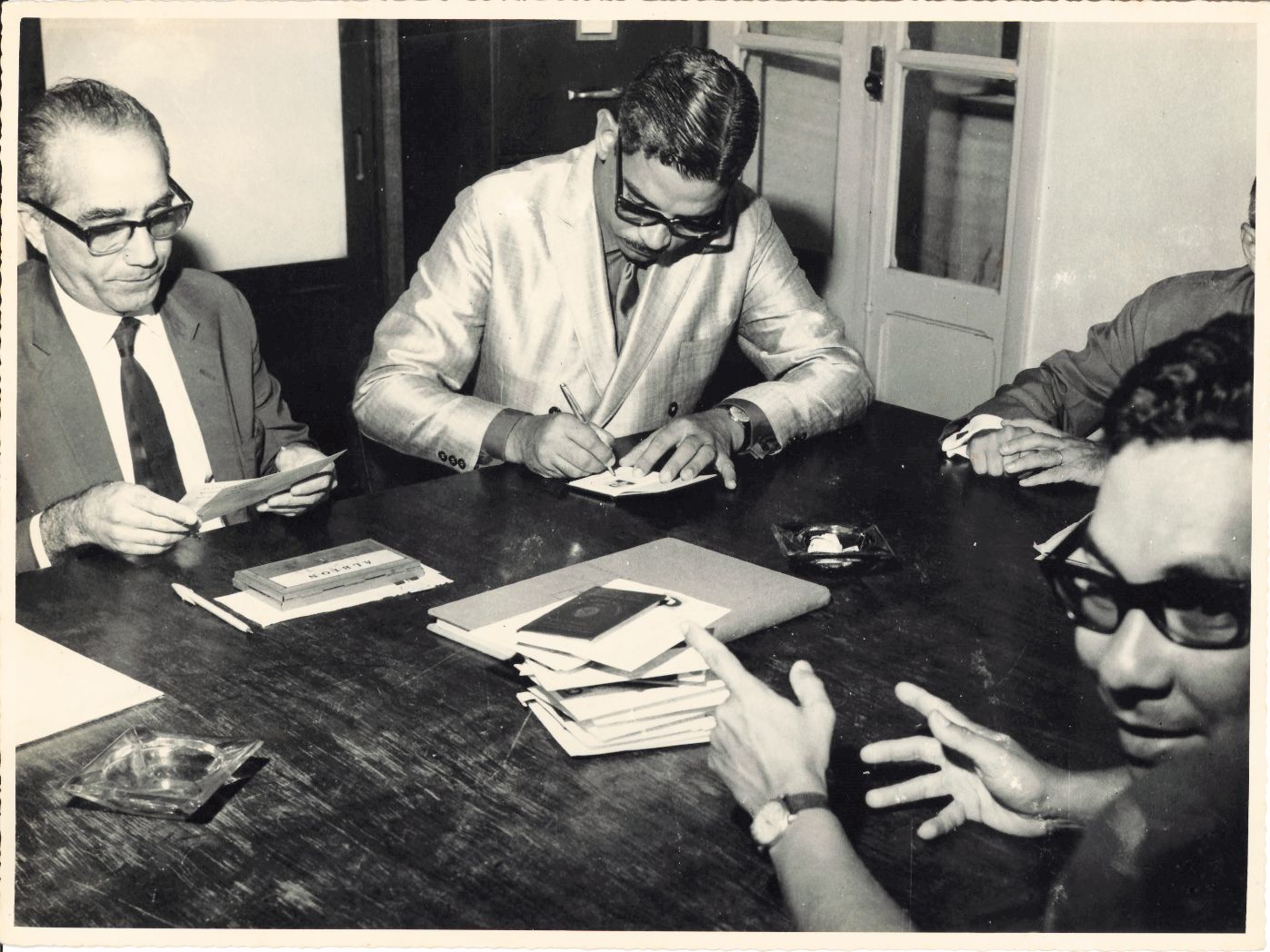 Vê-se o último ângulo da reunião realizada em local não identificado da qual participou o professor Adierson Erasmo de Azevedo, reitor da UFRPE, ao lado de outras sete autoridades também não identificadas. Como essa fotografia não possui uma data especificada, adotamos o ano de 1971 como a data em que foi registrada. Esse registro destacou o professor Adierson Erasmo de Azevedo, tendo às suas costas um arquivo de metal, parte de um móvel, talvez um armário e uma porta de vidro. Dessa feita, o reitor Adierson aparece assinando seu passaporte tendo ao seu lado direito um senhor que está lendo um documento tendo na mesa à sua frente uma caneta e uma espécie de almofada para carimbo. Nesse ângulo, também aparecem apenas as mãos do senhor de óculos escuros, que continua sentado à cabeceira da mencionada mesa. Aparecem do lado direito da mesa, a cabeça de um dos participantes dialogando com outros participantes ao seu lado. Vê-se ainda sobre a mesa a pilha de passaportes em cujas capas está escrito República Federativa do Brasil, ao lado dela aparece um caderno ou um livro fechado, e dois cinzeiros de vidro, o da esquerda vazio e o da direita com resíduos. Pode-se ver que o professor Adierson Erasmo de Azevedo e o senhor que está sentado ao seu lado encontram-se usando terno e gravata. Durante a entrevista para rememoração, ao observar a fotografia, o reitor Adierson falou: “É uma pena, mas não lembro... (Observando... Tamborilando...) Não consigo lembrar...” FONTES DE PESQUISA: Entrevista concedida às bibliotecárias Conceição Martins e Vania Ferreira para atender aos objetivos do Repositório Institucional, projeto “(Re) Memórias da UFRPE”, para a contextualização das imagens do acervo fotográfico do reitorado do Prof. Dr. Adierson Erasmo de Azevedo, no período de dezembro de 1969 a agosto de 1973. Acervo localizado no Núcleo do Conhecimento Professor João Baptista Oliveira dos Santos, da Biblioteca Central da UFRPE. Entrevista realizada no dia 27 de abril de 2016, no Espaço Santander da Biblioteca Central da UFRPE. Duração de 2h17min com transcrição e pesquisa complementar da bibliotecária Conceição Martins.
