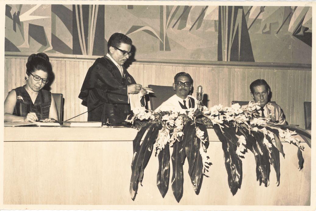 Registra a posse do professor Luiz de Melo Amorim como diretor da Escola Superior de Medicina Veterinária da UFRPE, realizada no salão nobre da UFRPE. Vendo-se compondo a mesa diretora, que aparece ornamentada com um belo arranjo floral, aparecem da esquerda para a direita: a secretária Dulce Diniz Tapaviocshy; o professor Luiz de Melo Amorim, empossado como diretor da Escola Superior de Veterinária; o professor Adierson Erasmo de Azevedo, reitor da UFRPE e ao seu lado esquerdo, o senhor Antônio Santiago Pessoa, secretário de Agricultura do Estado de Pernambuco. Durante a entrevista para rememoração, o reitor Adierson falou: “Esse aqui sou eu acompanhado por essas importantes pessoas... Saibam que para mim, rever essas fotos tem sido um exercício para minha memória, uma beleza!” FONTES DE PESQUISA: Entrevista concedida às bibliotecárias Conceição Martins e Vania Ferreira para atender aos objetivos do Repositório Institucional, projeto “(Re) Memórias da UFRPE”, para a contextualização das imagens do acervo fotográfico do reitorado do Prof. Dr. Adierson Erasmo de Azevedo, no período de dezembro de 1969 a agosto de 1973. Acervo localizado no Núcleo do Conhecimento Professor João Baptista Oliveira dos Santos, da Biblioteca Central da UFRPE. Entrevista realizada no dia 15 de abril de 2016, no Espaço Santander da Biblioteca Central da UFRPE. Duração de 2h17min com transcrição e pesquisa complementar da bibliotecária Conceição Martins. AZEVEDO, Adierson Erasmo de. A “Caminhada seguindo o Sol” da Universidade Federal Rural de Pernambuco. Recife: Editora UFRPE, 2007.