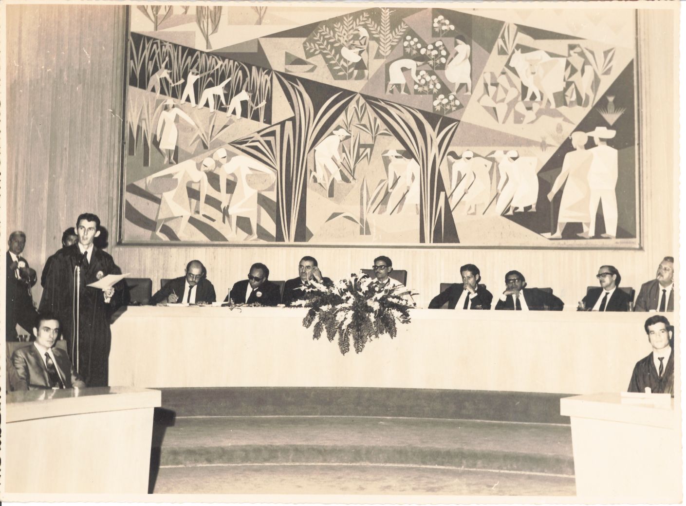 Fotografia que registra a solenidade de colação de grau da turma de Agronomia do ano de 1969, realizada no salão nobre da UFRPE, vendo-se a mesa diretora, onde encontram-se o reitor Adierson e mais 07 autoridades. Pode-se observar ainda do lado esquerdo, o aluno orador que se encontra de pé diante do microfone fazendo o seu discurso. Vê-se também detalhes das bancadas destinadas aos membros do Conselho Universitário localizadas no lado direito e esquerdo onde aparecem em cada uma delas um Conselheiro sentado. Aparecem ainda do lado esquerdo, atrás do aluno que discursa, um fotógrafo e mais outra pessoa não identificada. Chama a atenção acima da mesa diretora, o painel de autoria de Lula Cardoso Ayres, criado para compor o salão nobre da UFRPE. Durante a rememoração e tomando conhecimento que se trata da turma de Agronomia de 1969, o reitor se emocionou, pois, lembrou que essa foi a primeira turma de Agronomia que colou grau em seu reitorado. Como no verso não apareceram relacionados os nomes dos formandos, buscou-se a “Plaquete dos 80 Anos dos Cursos das Ciências Agrárias” e assim foi possível identificar todos os que se formou nessa turma composta por 62 alunos, sendo 60 homens e 02 mulheres. O reitor, visivelmente, emocionado, pediu para lermos os nomes de todos os formandos. Finalizada a leitura, comentou “Essa foi a turma do Professor Rildo Sartori, Vice-Reitor do reitor João Baptista Oliveira dos Santos de 1987 a 1991. Esse é realmente um trabalho primoroso que vocês estão fazendo, me trazendo as fotografias e me levando de volta no tempo para lembrar cada uma delas, tenho certeza que facilitará o entendimento das novas gerações que acessarem essas fotografias. Parabéns!”. FONTES DE PESQUISA: Entrevista concedida às bibliotecárias Conceição Martins e Vania Ferreira para atender aos objetivos do Repositório Institucional, projeto “(Re) Memórias da UFRPE”, para a contextualização das imagens do acervo fotográfico do reitorado do Prof. Dr. Adierson Erasmo de Azevedo, no período de dezembro de 1969 a agosto de 1973. Acervo localizado no Núcleo do Conhecimento Professor João Baptista Oliveira dos Santos da Biblioteca Central da UFRPE. Entrevista realizada no dia 13 de abril de 2016, no Espaço Santander da Biblioteca Central da UFRPE. Duração de 2h40min com transcrição e pesquisa complementar da bibliotecária Conceição Martins. AZEVEDO, Adierson Erasmo de. A “Caminhada seguindo o Sol” da Universidade Federal Rural de Pernambuco. Recife: Editora UFRPE, 2007. 80 anos dos cursos de Ciências Agrárias da UFRPE 1912-1992. Recife, Imprensa Universitária, 1994. p. 59 – 60. Martins, Conceição. Eudes de Souza Leão Pinto: In memoriam. Anais da Academia Pernambucana de Ciência Agronômica, Recife, v. 15, n.2, p. 13-19, 2018. Disponível em: http://journals.ufrpe.br/index.php/apca/article/view/2228/482482834