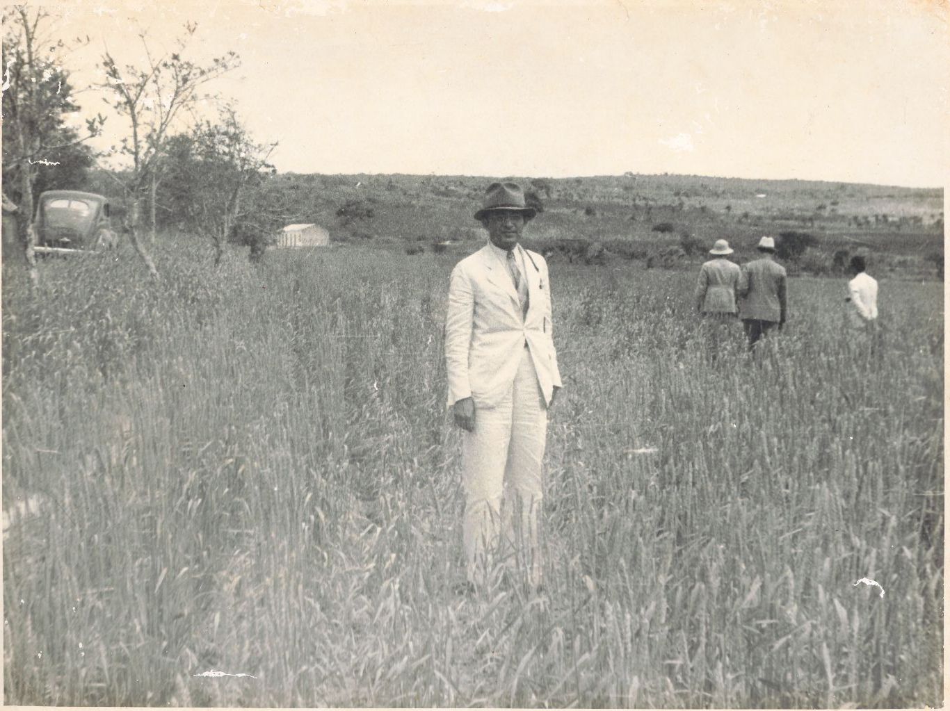 Retrata o engenheiro agrônomo Manuel Rodrigues Filho posando durante visita ao campo de trigo localizado em Garanhuns, Pernambuco, no ano de 1945, enquanto estava secretário de Agricultura, Indústria e Comércio de Pernambuco, três anos após sua nomeação através do Ato nº 302 de 24 de fevereiro de 1942, para o período de 1942 a 1946. Corresponde, portanto, ao período anterior ao seu reitorado na Universidade Rural de Pernambuco – URP. Essa imagem referenda o acervo fotográfico do seu reitorado, pois, além de ter sido o primeiro reitor no período em que a Escola Superior de Agricultura (ESAP) se transformou na atual UFRPE, sua gestão foi fundamental para o desenvolvimento da universidade. Observa-se que ele veste terno branco, camisa branca, gravata listrada, óculos e chapéu de abas curtas, olha para a câmera fotográfica. Encontra-se de pé em uma área ampla onde se contempla a finitude deste campo de trigo sob o céu, a presença do vento provocando redemoinhos no pulsar do trigo sobre o chão. Matéria prima do pão, o trigo, transmite a mensagem de fartura e de abundância, antes de ser colhido, fica seco e dourado. Tamanha é a importância desse alimento que existe até mesmo uma deusa grega em homenagem aos grãos comestíveis, chamada Ceres. No ângulo direito da fotografia, observa-se três homens que seguem adiante, sendo que um deles usa terno branco sem chapéu e os outros dois usam terno de cor e chapéus de cor clara. Ao final da fotografia percebe-se uma área vasta e no ângulo lateral esquerdo, há uma casa ou galpão na cor branca, alguns arbustos, e um automóvel estacionado, de marca Ford Perfect, de cor escura, cujo ano não foi identificado. FONTES DE PESQUISA: ACADEMIA PERNAMBUCANA DE CIÊNCIA AGRONÔMICA. Manuel Rodrigues Filho: Patrono da cadeira 20 - Biografia. Disponível em: pcagronomica.org.br/cadeira20/. Acesso em: 20 dez. 2023. PESQUISA COMPLEMENTAR: BARTHES, Roland. A câmara clara: nota sobre a fotografia. Rio de Janeiro: Nova Fronteira, 1984; KOSSOY, Boris. Construção e desmontagem do signo fotográfico. In: _____. Realidades e ficções na trama fotográfica. São Paulo: Ateliê Editorial, 2002.