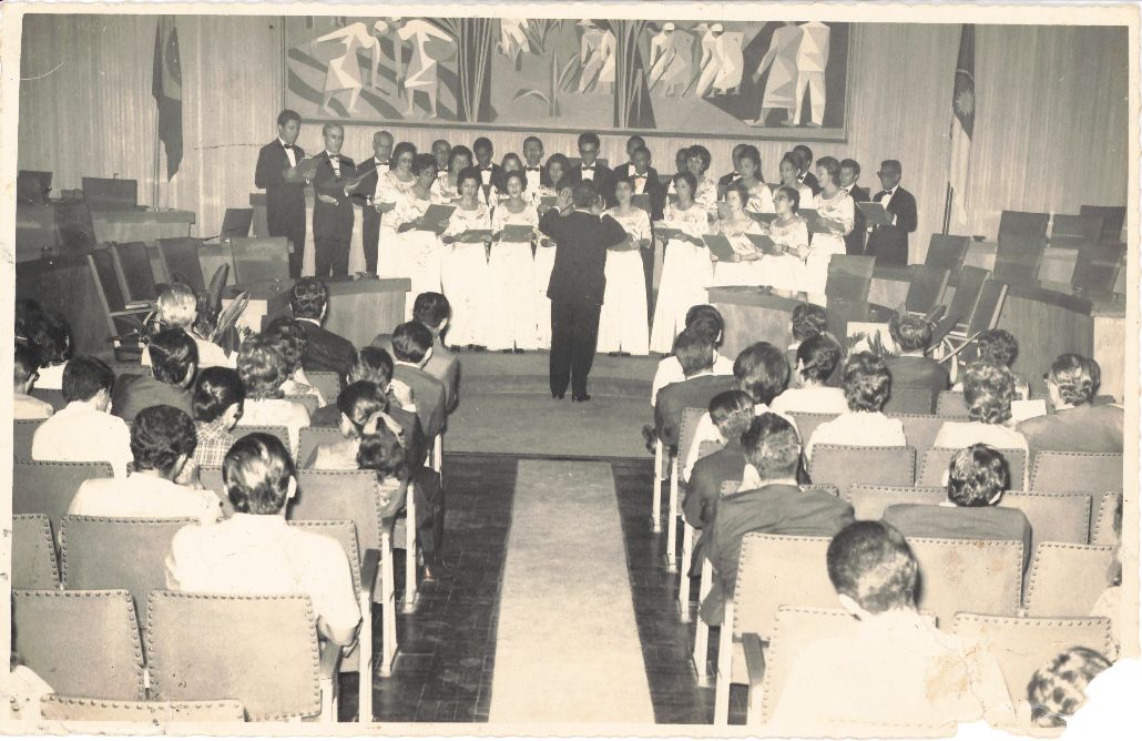 Retrata uma solenidade realizada no salão nobre da UFRPE, na qual o Coral Universitário encontra-se se apresentando. Como essa fotografia não possui uma data especificada, adotamos o ano de 1971 como a data em que foi registrada. Vê-se o coral posicionado de frente para o público, diante da mesa de honra localizada na área onde se reúnem os membros dos Conselhos Superiores da UFRPE durante as solenidades. Vê-se também parte do painel de Lula Cardoso Aires, localizado na parede ao fundo do salão nobre. O mencionado painel foi criado por Lula Cardoso Aires no ano de 1957, atendendo solicitação do reitor Manuel Rodrigues Filho. Essa obra de arte reproduz cenas que refletem a alma nordestina e as áreas geográficas de atuação da UFRPE: o litoral, a zona da mata, o agreste e o sertão. Durante a entrevista para rememoração, ao observar a fotografia, o reitor Adierson falou: “Muito bonita essa apresentação do coral... Bonita mesmo... Deve ter sido uma das primeiras apresentações... Criei o Coral porque toda Instituição que se respeita tem um Coral e aqui não existia. Uma beleza! O Coral passou a embelezar as solenidades oficiais da Universidade. Aqui na foto, vejo que está sendo regido por um homem.... Por alguma razão, a professora Vânia que era a regente, não esteve presente. Ela era da Igreja Batista da Capunga, era a regente do Coral daquela Igreja então a convidei, ela aceitou e a nomeei.” FONTES DE PESQUISA: Entrevista concedida às bibliotecárias Conceição Martins e Vania Ferreira para atender aos objetivos do Repositório Institucional, projeto “(Re) Memórias da UFRPE”, para a contextualização das imagens do acervo fotográfico do reitorado do Prof. Dr. Adierson Erasmo de Azevedo, no período de dezembro de 1969 a agosto de 1973. Acervo localizado no Núcleo do Conhecimento Professor João Baptista Oliveira dos Santos, da Biblioteca Central da UFRPE. Entrevista realizada no dia 27 de abril de 2016, no Espaço Santander da Biblioteca Central da UFRPE. Duração de 2h17min com transcrição e pesquisa complementar da bibliotecária Conceição Martins. PESQUISA COMPLEMENTAR: Prédio da reitoria da UFRPE: Resgate histórico 1935-2011. Conceição Martins, Maria do Rosário de Fátima Andrade Leitão (Organizadoras). Recife: UFRPE, 2009.185 p.