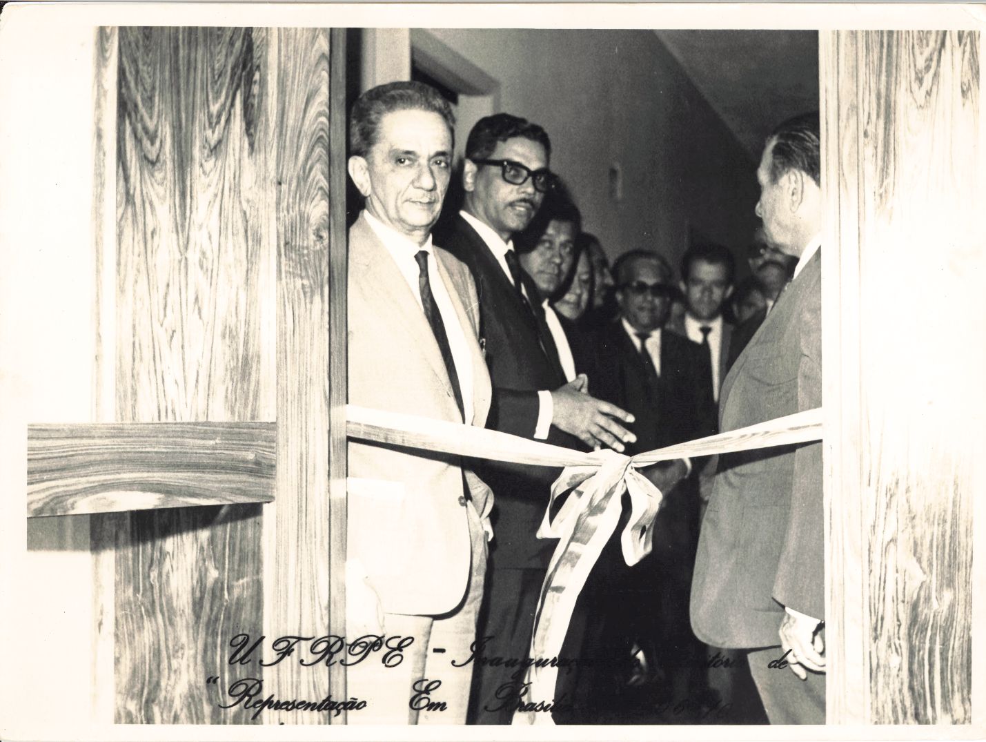 Registra a inauguração da sede da Representação da UFRPE em Brasília, DF, em 1970. Durante entrevista para a rememoração, o reitor Adierson Erasmo de Azevedo, ao observar a fotografia ficou exultante, pois lembrou que era o registro da inauguração da sede da representação da UFRPE em Brasília, DF, em 19 de junho de 1970 e passou a ser um local de importância estratégica para a UFRPE. Segundo suas palavras: “essa representação, tinha por objetivo era facilitar a tramitação dos documentos da Universidade no Ministério da Educação e demais Órgãos e Setores da esfera federal, assim como, mediar e facilitar o acesso e os contatos da administração superior e professores da Universidade com autoridades do Governo Federal.” Na fotografia aparecem importantes autoridades, o professor Adierson após observar com cuidado, identificou o Ministro da Educação, Professor Jarbas Passarinho, o reitor da UFPE, Professor Murilo Guimarães, o Deputado Federal, Dr. Petronilo Santa Cruz, entre outras autoridades. Ainda observando a fotografia, o reitor Adierson comentou: “A Rural tinha um escritório em Brasília com uma equipe de funcionários e nossos processos eram acompanhados por Dr. Petronilo que tinha larga experiência política e fácil acesso nos Ministérios, além de ser muito bem relacionado.” FONTES DE PESQUISA: Entrevista concedida às bibliotecárias Conceição Martins e Vania Ferreira para atender aos objetivos do Repositório Institucional, projeto “(Re) Memórias da UFRPE”, para a contextualização das imagens do acervo fotográfico do reitorado do Prof. Dr. Adierson Erasmo de Azevedo, no período de dezembro de 1969 a agosto de 1973. Acervo localizado no Núcleo do Conhecimento Professor João Baptista Oliveira dos Santos , da Biblioteca Central da UFRPE. Entrevista realizada no dia 15 de abril de 2016, no Espaço Santander da Biblioteca Central da UFRPE. Duração de 2h17min com transcrição e pesquisa complementar da bibliotecária Conceição Martins. AZEVEDO, Adierson Erasmo de. A “Caminhada seguindo o Sol” da Universidade Federal Rural de Pernambuco. Recife: Editora UFRPE, 2007.