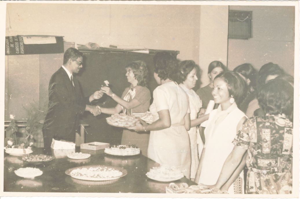 Registra mais um ângulo da comemoração do aniversário do Reitor realizada no Departamento de Economia Doméstica no ano de 1969.Vendo-se o reitor Adierson Erasmo de Azevedo, o aniversariante, sorridente recebendo os cumprimentos, na ocasião, num gesto carinhoso e gentil, agradece ofertando uma rosa a cada uma das professoras presentes à comemoração. Observa-se que do lado esquerdo da sala atrás do reitor, há um armário e sobre ele encontram-se alguns cartazes, na parede ao lado, após uma coluna, vê-se um aparelho de ar-condicionado. Durante a entrevista para rememoração, ao observar a fotografia, o reitor Adierson falou: “Ah! (Risos) .... Essas moças eram professoras do Curso de Economia Doméstica.... Não lembro seus nomes. Como falei anteriormente, minha esposa, Líbia, ciente dessa comemoração, organizou uma forma de eu agradecer as homenagens que iria receber, então levou um vaso com rosas que colocou num canto da mesa e a cada presente que eu recebia das professoras participantes, eu lhes entregava uma rosa! (Risos...). Elas estavam sendo gentis comigo então decidimos retribuir. Esse foi um dos momentos felizes que vivi na reitoria. (Observando) ...” FONTES DE PESQUISA: Entrevista concedida às bibliotecárias Conceição Martins e Vania Ferreira para atender aos objetivos do Repositório Institucional, projeto “(Re) Memórias da UFRPE”, para a contextualização das imagens do acervo fotográfico do reitorado do Prof. Dr. Adierson Erasmo de Azevedo, no período de dezembro de 1969 a agosto de 1973. Acervo localizado no Núcleo do Conhecimento Professor João Baptista Oliveira dos Santos, da Biblioteca Central da UFRPE. Entrevista realizada no dia 29 de abril de 2016, no Espaço Santander da Biblioteca Central da UFRPE. Duração de 2h24min com transcrição da bibliotecária Conceição Martins.