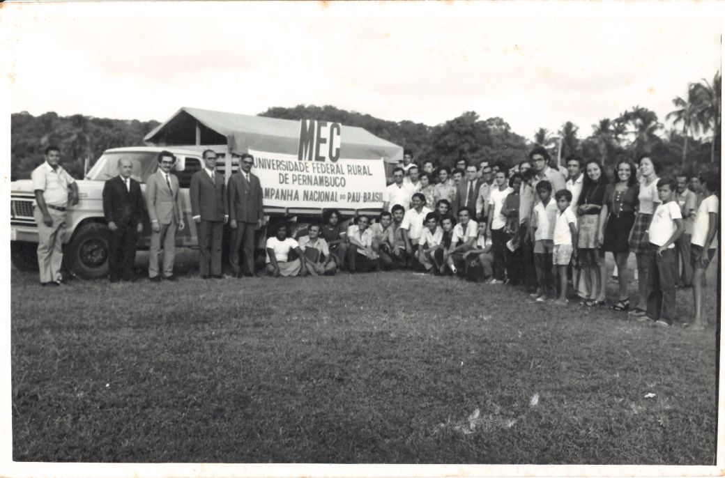 Registra a Campanha Nacional do Pau-brasil promovida pela UFRPE no ano de 1972,idealizadaa partir do esforço conjuntopara a preservação do pau-brasil iniciado nos idos de 1967, por três professores do Colégio Agrícola Colégio Agrícola Dom Agostinho Ikas (Codai), localizado em Tapera, Município de São Lourenço, Roldão de Siqueira Fontes, Osvaldo Martins Furtado de Souza e Jovino José dos Santos. Na fotografia, vê-se o caminhão da frota de automóveis da UFRPE estacionado,contendo um toldo para proteção das mudas e uma faixa posicionada na lateral onde se lê: “MEC – Universidade Federal Rural de Pernambuco – Campanha Nacional do Pau-brasil”, ocasião em que se iniciava a condução das mudas de pau-brasil para Brasília. Posicionados diante da boleia do caminhão, encontram-se o professor Adierson Erasmo de Azevedo ao lado professor Murilo Salgado Carneiro, respectivamente, reitor e vice-reitor da UFRPE. Àdireita dos mesmos, encontram-se Apulcro Menezes, chefe de gabinete da reitoria tendo à sua direita, um professor não identificado eo motorista condutor do mencionado caminhão, cujo nome não foi identificado. Observa-se também a presença de um grupo grande de pessoas não identificadas, entre elas, encontra-se o professor Izaias Vieira da Silva, diretor do Colégio Agrícola Dom Agostinho Ikas (Codai), trajando paletó e gravata. Percebe-se a participação de algumas criançascujos nomesnão foram identificados.Durante a entrevista para rememoração, ao observar a fotografia, o reitor Adierson falou: “Este aqui é Murilo Salgado, meu vice-reitor... Eis Apulcro, meu chefe de gabinete, esse que está ao lado dele eu sei quem é, mas agora não lembro o nome... Roldão e outros professores do Colégio Agrícola se preocupavam com a preservação do Pau-brasil,ele veiofalar comigo e então, o convidei para organizar a “Campanha Nacional do Pau-brasil”... Para dar mais visibilidade a sua campanha de restauração do Pau-Brasil, apoiei sua ideia e transformei sua iniciativa pessoal numa campanha institucional, autorizei a saída de 01 caminhão da UFRPE com as mudas de pau-brasil daqui da Rural para Brasília...Hum! Esse motorista tinha muito compromisso com a UFRPE, por isso foi escolhido para conduzir as mudas nesse percurso tão longo. (Observando...) ...Muita gente foi acompanhar a saída do caminhão levando as mudas, foi um momento bonito e importante para a Rural... Roldão foi nesse caminhão como coordenador até Brasília para entregar as mudas ao irmão do coronel Ivan Rui, no Ministério do Exército, a partir dali ele com os soldados se encarregaram de distribuí-las. Roldão,ao longo do caminho de Pernambuco a Brasília, distribuiu cerca de 10 mil mudas nas escolase nas cidades por onde passou... Foi um sucesso! Quando ele voltou, continuamos com a sementeira em Tapacuráenviando mudas para outras cidades de Pernambuco e de outros estados.... Essa foi a 1ª Campanha Nacional do Pau-brasil... O Recife está cheio de Pau-brasil fruto dessa 1ª campanha!”. FONTES DE PESQUISA: Entrevista concedida às bibliotecárias Conceição Martins e Vania Ferreira para atender aos objetivos do Repositório Institucional, projeto “(Re) Memórias da UFRPE”, para a contextualização das imagens do acervo fotográfico do reitorado do Prof. Dr. Adierson Erasmo de Azevedo, no período de dezembro de 1969 a agosto de 1973. Acervo localizado no Núcleo do Conhecimento Professor João Baptista Oliveira dos Santos, da Biblioteca Central da UFRPE. Entrevista realizada no dia 04 de maio de 2016, no setor de Normalização da Biblioteca Central da UFRPE. Duração de 2h32min22seg, com transcrição e pesquisa complementar da bibliotecária Conceição Martins.PESQUISA COMPLEMENTAR: SOARES, Célia Marinho da Costa. Pau-brasil: a árvore nacional. Recife: Imprensa Universitária da UFRPE, [198-]; SOUZA, Osvaldo Martins Furtado de. Reserva de pau-brasil. Separata de: Revista do Departamento de Cultura[da] Secretaria de Educação e Cultura, Recife, n. 5, p. 65-68, 1972; _____ Esse ilustre desconhecido. Recife: Secretaria de Educação e Cultura, n. 5, 1972;____. O que fui e o que sou. Anais da Academia Pernambucana de Ciência Agronômica, Recife, v. 2, p.63-64, 2005. Disponível em: http://journals.ufrpe.br/index.php/apca/article/view/67/63; ESTAÇÃO ECOLÓGICA DO TAPACURÁ (PE). Campanha do pau-brasil. Recife: Imprensa Universitária da UFRPE [197-?]; BRASIL. Lei nº 6.607, de 12 de dezembro de 1978. Declara o Pau-Brasil árvore nacional, institui o Dia do Pau-Brasil, e dá outras providências. Brasília: Diário Oficial da União - Seção 1, Página 19910.Disponível em: https://www2.camara.leg.br/legin/fed/lei/1970-1979/lei-6607-7-dezembro-1978-366455-publicacaooriginal-1-pl.html.
