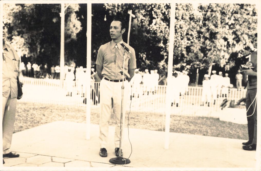 Registra a quarta fotografia relativa ao hasteamento das bandeiras durante a solenidade de inauguração da Escola Lions Recife Parnamirim, construída com recursos angariados pelo Lions Clube Recife Parnamirim Distrito L14, em terreno cedido pela Universidade Federal Rural de Pernambuco, ocorrida no dia 28 de agosto de 1971. Nesta fotografia, clicada também no mesmo espaço das fotografias anteriores, vê-se o professor Waldecy Fernandes Pinto, docente da UFRPE e membro Lions Clube diante do microfone dirigindo-se aos presentes. À sua esquerda, é possível ver ainda que pouco, um senhor segurando uma pasta e, à sua direita outro senhor segurando um equipamento tipo uma filmadora. Durante a entrevista para rememoração, ao observar a fotografia, o reitor Adierson falou: “(Estou altamente emocionado em estar aqui vendo todas essas fotografias... Eu não sabia que tinha essa quantidade toda... Sinceramente, eu não sabia!”. FONTES DE PESQUISA: Entrevista concedida às bibliotecárias Conceição Martins e Vania Ferreira para atender aos objetivos do Repositório Institucional, projeto “(Re) Memórias da UFRPE”, para a contextualização das imagens do acervo fotográfico do reitorado do Prof. Dr. Adierson Erasmo de Azevedo, no período de dezembro de 1969 a agosto de 1973. Acervo localizado no Núcleo do Conhecimento Professor João Baptista Oliveira dos Santos, da Biblioteca Central da UFRPE. Entrevista realizada no dia 04 de maio de 2016, no setor de Normalização da Biblioteca Central da UFRPE. Duração de 2h32min22seg. com transcrição e pesquisa complementar da bibliotecária Conceição Martins.