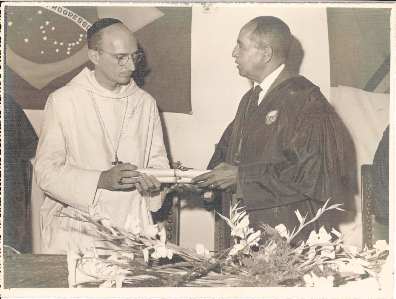 Registra o último flash fotográfico da Solenidade comemorativa do Jubileu de Ouro da Escola Superior de Agricultura da Universidade Rural de Pernambuco - URP, realizada nas antigas instalações da Escola Superior de Agricultura - ESA, localizada nas instalações do Engenho São Bento, no município de São Lourenço da Mata, Pernambuco, em 03 de novembro de 1962. Organizada pela equipe do reitorado do professor Renato Ramos de Farias, reitor da UFRPE, que coordenou e realizou as festividades que emocionaram a comunidade universitária, convidados e os Monges Beneditinos que propiciaram os primeiros passos dessa Instituição de Ensino Superior. O fotógrafo se posicionou próximo ao centro da mesa diretora e registrou a entrega dos Títulos de Professores Beneméritos aos antigos mestres Monges Beneditinos como muitos estiveram ausentes, não foi possível entregar-lhes pessoalmente nessa solenidade. Dessa forma, os citados Títulos foram entregues pelo reitor Renato Ramos de Azevedo que, pé, vestindo a beca, veste talar ou traje oficial própria da vestimenta do Cerimonial Universitário, usado pelo reitor nas solenidades oficiais, olha e entrega os diplomas nas mãos ao Dom Basílio Penido O.S.B., que veste hábito branco e barrete na cor preta, Abade do Mosteiro de São Bento de Olinda. NOTA IMPORTANTE: As Escolas Superiores de Agricultura e Veterinária São Bento, idealizadas pelo Abade D. Pedro Rooser O.S.B. e demais Monges Beneditinos do Mosteiro de São Bento, localizado em Olinda, Pernambuco, foram fundadas em 03 de novembro de 1912. Instaladas, inicialmente, no prédio anexo ao Mosteiro, iniciaram as aulas do primeiro semestre dos cursos de Agronomia e Veterinária no dia 1º de fevereiro de 1914. Em 1917, a Escola de Agricultura em virtude da necessidade de áreas para aulas práticas e campos de cultura, foi renomeada para Escola de Agronomia “São Bento” - ESA e transferida para o interior do Estado, passado a funcionar no Engenho São Bento, de propriedade da Ordem Beneditina da Ordem Beneditina, localizado no município de São Lourenço da Mata a oito quilômetros da Estação Tapera. Enquanto isso, a Escola Superior de Veterinária, continuou funcionando, ao lado do Mosteiro, em Olinda, contudo em virtude da falta de demanda, deixou de funcionar em 1926. Ambas as Escolas são a célula Mater da Universidade Federal Rural de Pernambuco - UFRPE. FONTE DE PESQUISA: Informações escritas a caneta no verso da fotografia; PESQUISA COMPLEMENTAR: BURKE, Peter. Testemunha ocular: o uso de imagens como evidência histórica. São Paulo: Editora Unesp, 2017; GOMES, Simone. Cerimonial da UFRPE. Depoimento oral concedido à bibliotecária Conceição Martins em 15 de setembro de 2023; UNIVERSIDADE RURAL DE PERNAMBUCO. Plaquete comemorativa do cinquentenário da Escola Superior de Agricultura da Universidade Rural de Pernambuco: 1912-1962. Recife: Imprensa Universitária URP, 1962; ______. Plaquete oitenta anos dos cursos das Ciências Agrárias: 1912-1992. Recife: Imprensa Universitária URP, 1994.