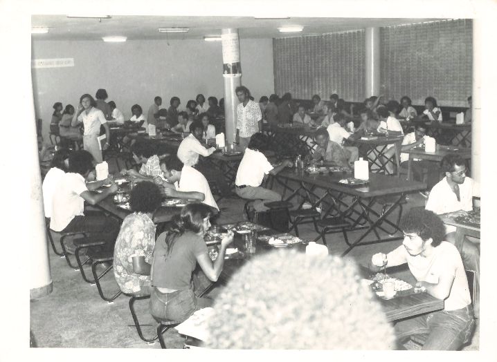 Revela outro ângulo do restaurante universitário da UFRPE no mesmo dia da fotografia 0268, durante o almoço servido aos estudantes, professores e servidores. Na fotografia, pode-se observar que a maior parte das mesas continua ocupada. Vê-se três pessoas de pé se movimentando entre as mesas. É possível ver que há uma faixa colada na parede ao fundo e cartazes presos na coluna central, no entanto, é impossível ler o conteúdo dos mesmos. Durante a entrevista para rememoração, ao observar a fotografia, o reitor Adierson falou: “(Observando...) Essa foto realmente foi tirada no mesmo dia, dá para ver que essa dupla de estudantes e esse outro rapaz que estão almoçando também estão na fotografia anterior!Vejam... Dá uma saudade ver esses jovens no restaurante da UFRPE no meu reitorado... Olha aqui os cartazes! Eles tinham liberdade para divulgar informações ali, afinal o RU era um espaço de convivência!”. FONTES DE PESQUISA: Entrevista concedida às bibliotecárias Conceição Martins e Vania Ferreira para atender aos objetivos do Repositório Institucional, projeto “(Re) Memórias da UFRPE”, para a contextualização das imagens do acervo fotográfico do reitorado do Prof. Dr. Adierson Erasmo de Azevedo, no período de dezembro de 1969 a agosto de 1973. Acervo localizado no Núcleo do Conhecimento Professor João Baptista Oliveira dos Santos, da Biblioteca Central da UFRPE. Entrevista realizada no dia 04 de maio de 2016, no setor de Normalização da Biblioteca Central da UFRPE. Duração de 2h32min22seg. com transcrição e pesquisa complementar da bibliotecária Conceição Martins.