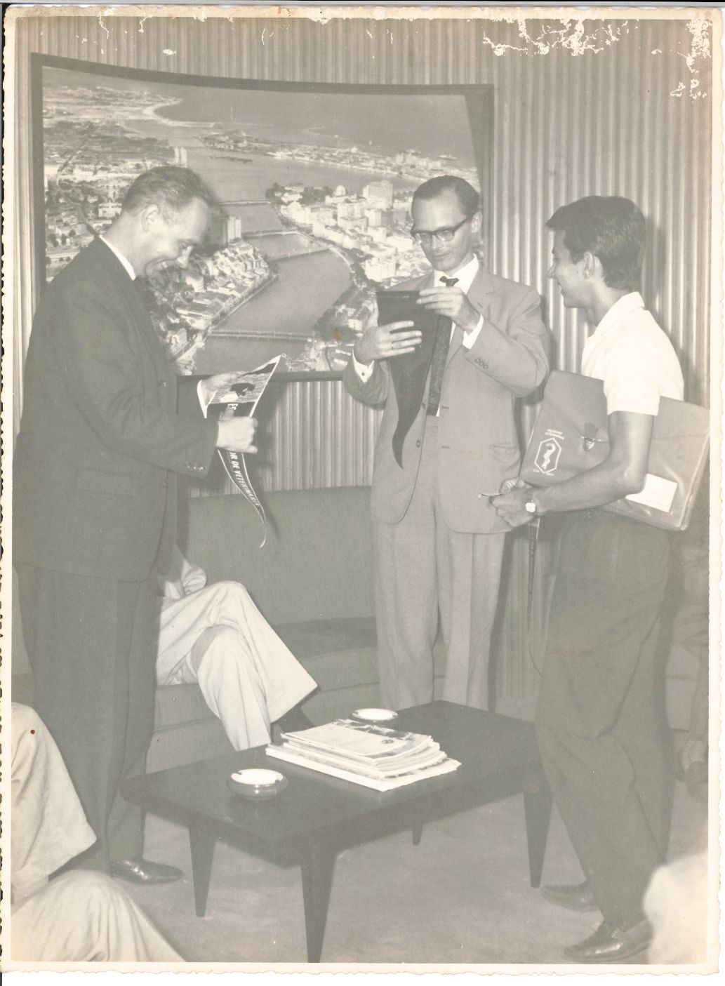 Registra a comitiva de professores da Escola de Medicina Veterinária da Universidade de Hanover, Alemanha, sendo recepcionada pelo reitor Renato Ramos de Farias, em seu gabinete na Reitoria da UFRPE. O fotógrafo congelou para a posteridade o segundo momento ocorrido entre o reitor, os membros da comitiva e um aluno não identificado que, representando as turmas da Escola de Medicina Veterinária da UFRPE, ofertou uma flâmula do Curso como brinde ao reitor e aos visitantes. Pode-se observar que o reitor Renato Ramos de Farias se encontra sentado no sofá, trajando terno de cor clara e camisa branca, aparecendo superficialmente, deixando à mostra apenas as pernas cruzadas e parte do tronco, pois está encoberto pelo professor visitante, que está de pé à sua frente, usando terno escuro, camisa branca e gravata escura, segurando e observando a flâmula enquanto sorri. Também nesse ângulo inferior esquerdo da fotografia, pode-se observar que aparecem, parcialmente, as pernas de outro homem não identificado que usa terno de cor clara. Vê-se no ângulo lateral direito da fotografia, outro professor usando terno de cor clara, gravata escura e óculos, sorrindo enquanto segura a flâmula que acabara de receber. Ao seu lado, está o aluno não identificado que ofertou as flâmulas ao reitor e aos convidados, ele traja camisa branca de magas curtas, relógio e calça escura, está sorrindo e tem uma pasta embaixo do braço esquerdo onde se vê a logomarca da Medicina Veterinária. Olhando com atenção, pode-se ver ainda uma cadeira posicionada ao lado do aluno e nela, ligeiramente, outro homem sem identificação. Aparecem parcialmente, um sofá e uma poltrona escuros que compõem o conjunto de móveis que integram parte do ambiente da Reitoria, assim como uma mesinha de centro em madeira escura sobre a qual há uma pilha de revistas e dois cinzeiros. Na parede que aparece na parte posterior do reitor e dos dois professores alemães, pode-se observar uma parede revestida em lambri de madeira e, nela, em destaque, um quadro com uma fotografia aérea da cidade do Recife deixando à mostra a beleza das suas pontes. FONTES DE PESQUISA: Informações escritas a lápis no verso da fotografia. PESQUISA COMPLEMENTAR: AMARAL, Muriel Emídio Pessoa. Lendo fotografias e produzindo sentido. Discursos Fotográficos, Londrina, v. 9, n. 14, p. 225-228, jan. /jun. 2013. Disponível em: http://dx.doi.org/10.5433/1984-7939.2013v9n14p225. Acesso em: 16 fev. 2024; BURKE, KOSSOY, Boris. Realidades e ficções na trama fotográfica. São Paulo: Ateliê Editorial, 2020; UNIVERSIDADE FEDERAL RURAL DE PERNAMBUCO. Plaquete comemorativa dos setenta anos de Medicina Veterinária em Pernambuco: (1912-1982). Recife: UFRPE, 1982.