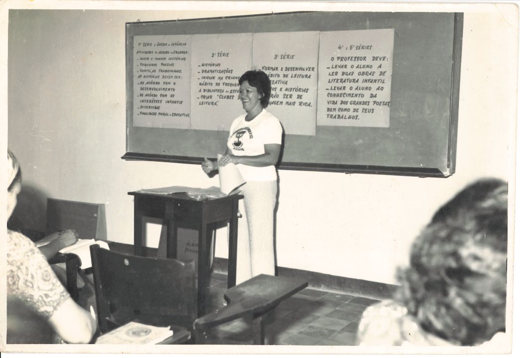 Registra uma aula do Curso de Reciclagem para professoras de 1º grau, promovido durante a Jornada Universitária da UFRPE realizada em Surubim, em 1971, coordenada pelo professor Marcos Cavalcanti Diniz. Em destaque, há uma professora diante do quadro de giz onde encontram-se 03 cartazes com textos relativos ao tema. Ela está usando uma camiseta branca com a logo da COATE e o lema do reitorado “A Caminhada seguindo o Sol”, e se dirige à turma que está sentada à sua frente. Ao seu lado, há uma mesinha, sobre a ela, alguns papéis e sob essa mesma mesinha aparece um Álbum Seriado. Pode-se observar a presença de 02 participantes que aparecem de costas para o fotógrafo.Durante a entrevista para rememoração, ao observar a fotografia, o reitor Adierson falou: “Observando... Sim, aconteceram várias Jornadas Universitárias sempre coordenadas pelo professor Marcos Diniz que contou com o apoio do professor Paulo Marques, ambos da Extensão. (Observando) .... Foram ações muito importantes porque levavam a universidade a ultrapassar seus portões e chegar perto das comunidades interioranas. Infelizmente, não lembro o nome dessa professora.”FONTES DE PESQUISA: Entrevista concedida às bibliotecárias Conceição Martins e Vania Ferreira para atender aos objetivos do Repositório Institucional, projeto “(Re) Memórias da UFRPE”, para a contextualização das imagens do acervo fotográfico do reitorado do Prof. Dr. Adierson Erasmo de Azevedo, no período de dezembro de 1969 a agosto de 1973. Acervo localizado no Núcleo do Conhecimento Professor João Baptista Oliveira dos Santos, da Biblioteca Central da UFRPE. Entrevista realizada no dia 29 de abril de 2016, no Espaço Santander da Biblioteca Central da UFRPE. Duração de 2h24min com transcrição da bibliotecária Conceição Martins. PESQUISA COMPLEMENTARrealizada pela Bibliotecária Conceição Martins: As Jornadas Universitárias eram coordenadas pelo professor Marcos Diniz, diretor da Coordenação de Atividades de Extensão – COATE, e pelo professor Paulo de Moraes Marques, ambos da Extensão Universitária. A COATE foi a célula materda atual Pró-Reitoria de Extensão, Cultura e Cidadania. Maiores informações sobre o lema do reitorado do professor Adierson Erasmo de Azevedo que aparece na camiseta da professora, “A Caminhada seguindo o Sol”, consultar:Azevedo, Adierson Erasmo de. A “caminhada seguindo o sol” da Universidade Federal Rural de Pernambuco. Recife: EDUFERPE, 2007. 147 p.; Paulo de Moraes Marques: memórias de um Extensionista rural. Recife: EDUFERPE, 2018. Disponível em: http://www.editora.ufrpe.br/Paulo_de_Moraes_Marques.