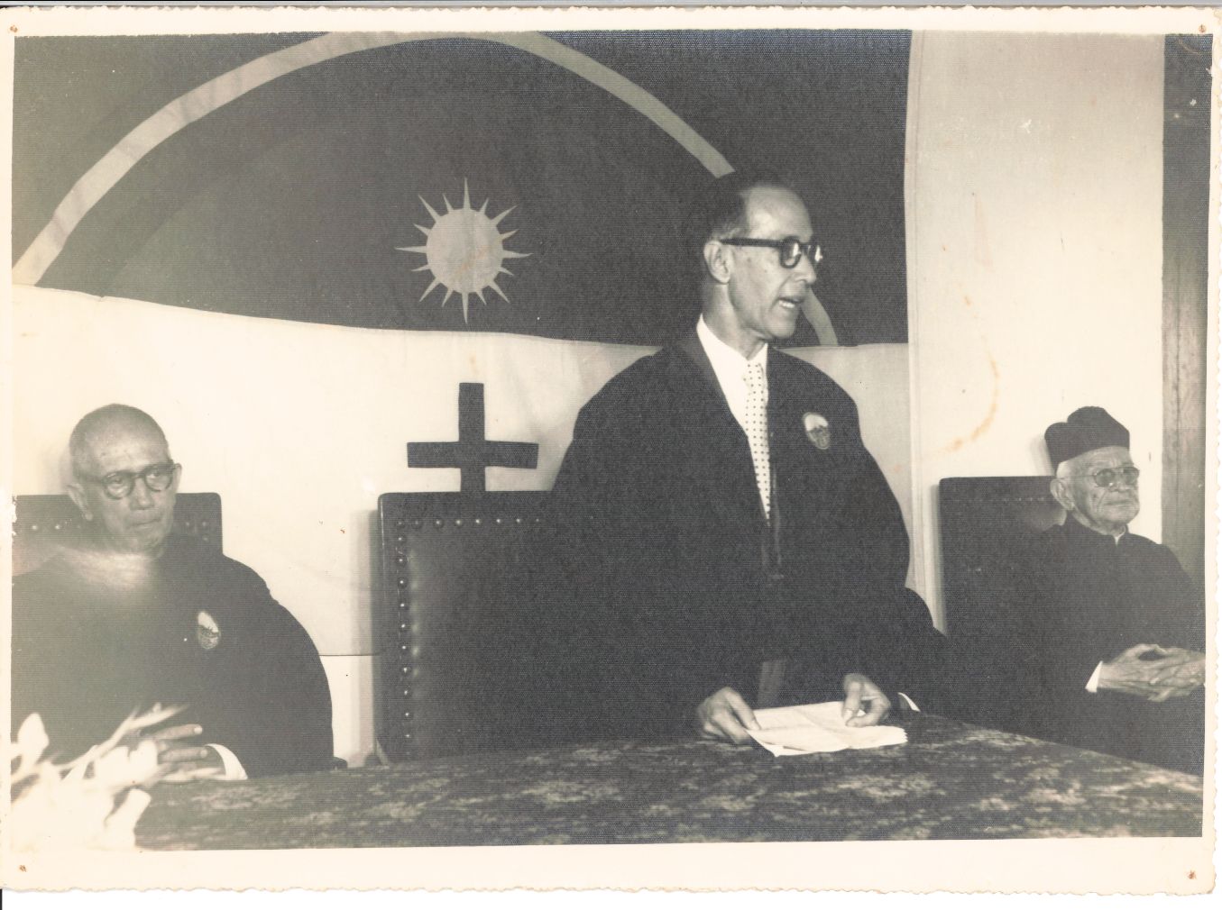 Flagrante da Solenidade comemorativa do Cinquentenário da Escola Superior de Agricultura da Universidade Rural de Pernambuco - URP, realizada nas antigas instalações da Escola Superior de Agricultura - ESA, localizada nas instalações do Engenho São Bento, no município de São Lourenço da Mata, Pernambuco, em 03 de novembro de 1962. Data que fez parte do reitorado do professor Renato Ramos de Farias a quem coube a responsabilidade de montar a equipe organizadora para fazer coordenar as festividades que aconteceram com emoção da comunidade universitária e dos Monges Beneditinos que propiciaram seus primeiros passos dessa Instituição de Ensino Superior. Vendo-se a mesa diretora da solenidade, diante da qual aparece de pé, discursando o professor João de Vasconcelos Sobrinho, docente da ESA, o qual inicialmente havia lecionado as disciplinas de Meteorologia e Climatologia e, em seguida, assumiu a disciplina de Botânica. Observa-se que ele traja terno e camisa brancos com gravata poá, usa óculos e sobre esse traje usa a beca, vestimenta do Cerimonial Universitário, usado pelos conselheiros nas solenidades oficiais e tem nas mãos seu discurso, contudo, fala naturalmente e de improviso. Vê-se também sentado à mesa no ângulo esquerdo da fotografia, Dom Pedro Bandeira de Melo, O.S.B., professor e ex-diretor da ESA, sobre a batina usa a beca, vestimenta do Cerimonial Universitário, usado pelos conselheiros nas solenidades oficiais e está com as mãos cruzadas e usa óculos. Ainda nesse mesmo ângulo, encontra-se sentada uma autoridade eclesiástica vestindo batina também chamada sotaina escura e sobre a cabeça um barrete. Vê-se parte do arranjo floral que ornamenta a mencionada mesa. No ângulo lateral direito da fotografia, há uma autoridade eclesiástica cujo nome não foi identificado. Na parede posterior aos membros da mesa diretora, vê-se a bandeira de Pernambuco. NOTA IMPORTANTE: As Escolas Superiores de Agricultura e Veterinária São Bento, idealizadas pelo Abade D. Pedro Rooser O.S.B. e demais Monges Beneditinos do Mosteiro de São Bento, localizado em Olinda, Pernambuco, foram fundadas em 03 de novembro de 1912. Instaladas, inicialmente, no prédio anexo ao Mosteiro, iniciaram as aulas do primeiro semestre dos cursos de Agronomia e Veterinária no dia 1º de fevereiro de 1914. Em 1917, a Escola de Agricultura em virtude da necessidade de áreas para aulas práticas e campos de cultura, foi renomeada para Escola de Agronomia “São Bento” - ESA e transferida para o interior do Estado, passado a funcionar no Engenho São Bento, de propriedade da Ordem Beneditina da Ordem Beneditina, localizado no município de São Lourenço da Mata a oito quilômetros da Estação Tapera. Enquanto isso, a Escola Superior de Veterinária, continuou funcionando, ao lado do Mosteiro, em Olinda, contudo em virtude da falta de demanda, deixou de funcionar em 1926. Ambas as Escolas são a célula Mater da Universidade Federal Rural de Pernambuco - UFRPE. FONTE DE PESQUISA: Informações escritas a lápis no verso da fotografia; PESQUISA COMPLEMENTAR: AMARAL, Muriel Emídio Pessoa. Lendo fotografias e produzindo sentido. Discursos Fotográficos, Londrina, v. 9, n. 14, p. 225-228, jan. /jun. 2013. Disponível em: http://dx.doi.org/10.5433/1984-7939.2013v9n14p225. Acesso em: 23 fev. 2024; BURKE, Peter. Testemunha ocular: o uso de imagens como evidência histórica. São Paulo: Editora Unesp, 2017; GOMES, Simone. Cerimonial da UFRPE. Depoimento oral concedido à bibliotecária Conceição Martins em 15 de setembro de 2023; UNIVERSIDADE RURAL DE PERNAMBUCO. Plaquete comemorativa do cinquentenário da Escola Superior de Agricultura da Universidade Rural de Pernambuco: 1912-1962. Recife: Imprensa Universitária URP, 1962; ______. Plaquete oitenta anos dos cursos das Ciências Agrárias: 1912-1992. Recife: Imprensa Universitária URP, 1994.