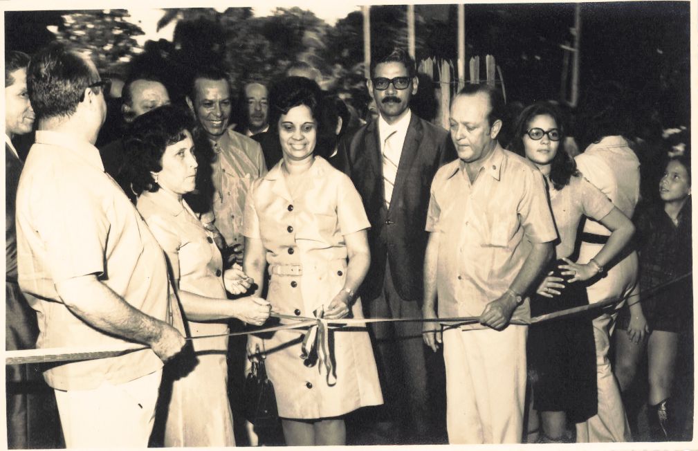 Documenta a sexta fotografia relativa a solenidade de inauguração da Escola Lions Recife Parnamirim, construída com recursos angariados pelo Lions Clube Recife Parnamirim Distrito L14, em terreno cedido pela Universidade Federal Rural de Pernambuco, ocorrida no dia 28 de agosto de 1971. Esta fotografia, registra o corte da fita pelos membros da diretoria da Escola e do Lions Clube. Vendo-se o professor Adierson Erasmo de Azevedo, reitor da UFRPE, professor Waldecy Fernandes Pinto, docente da UFRPE e membro do Lions Clube Parnamirim, Dr. Alfredo Vieira, presidente do Lions Clube Parnamirim, no centro vê-se segurando a fita, uma professora que iria dirigir a Escola. Observa-se ainda a presença do professor Eudes de Souza Leão Pinto, docente da UFRPE, entre as autoridades presentes. Durante a entrevista para rememoração, ao observar a fotografia, o reitor Adierson falou: “Quando a escola ficou pronta, me dirigi ao meu amigo Secretário de Educação do Estado de Pernambuco e solicitei que colocasse uma professora à disposição para dirigir a escola e ele prontamente me atendeu! Era justamente essa moça que aparece no centro da fotografia segurando a fita, lembro que ela era muito competente e fez um excelente trabalho. Infelizmente, não recordo o nome dela”. FONTES DE PESQUISA: Entrevista concedida às bibliotecárias Conceição Martins e Vania Ferreira para atender aos objetivos do Repositório Institucional, projeto “(Re) Memórias da UFRPE”, para a contextualização das imagens do acervo fotográfico do reitorado do Prof. Dr. Adierson Erasmo de Azevedo, no período de dezembro de 1969 a agosto de 1973. Acervo localizado no Núcleo do Conhecimento Professor João Baptista Oliveira dos Santos , da Biblioteca Central da UFRPE. Entrevista realizada no dia 04 de maio de 2016, no setor de Normalização da Biblioteca Central da UFRPE. Duração de 2h32min22seg. com transcrição e pesquisa complementar da bibliotecária Conceição Martins.