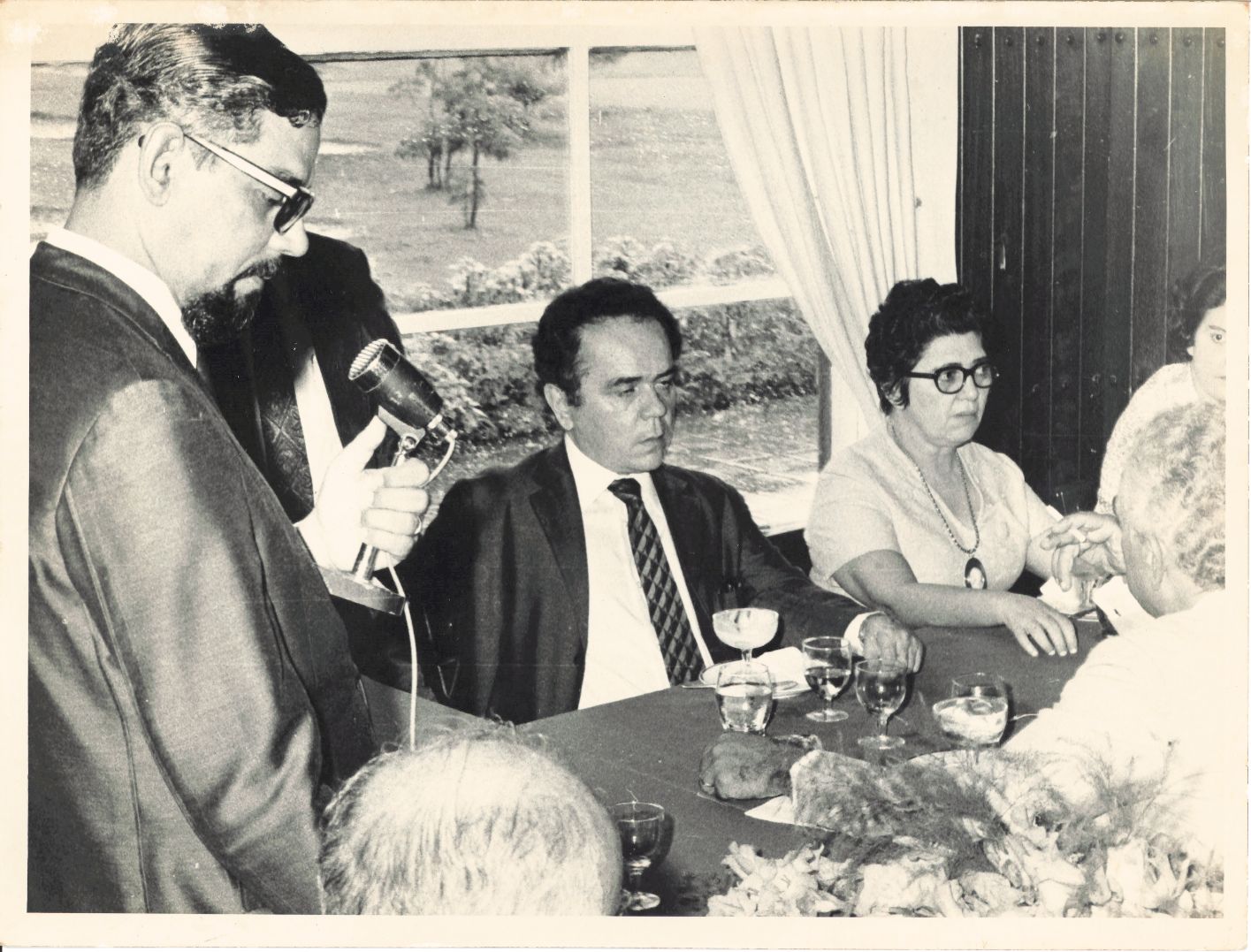 Registra o pronunciamento do reitor Adierson Erasmo de Azevedo durante confraternização ao lado de autoridades, dentre elas, vê-se Dona Maria de Lourdes Ferreira, diretora da Contabilidade da UFRPE. Durante a entrevista para rememoração, o reitor Adierson falou: “Sei quem são essas pessoas, mas não dá para... Uma pena. Dona Maria de Lourdes se destacava como profissional, para mim o sexo pouco interessava, na minha equipe eu queria competência e dedicação ao serviço era isso que me interessava e Dona Lourdes era um exemplo!” FONTES DE PESQUISA: Entrevista concedida às bibliotecárias Conceição Martins e Vania Ferreira para atender aos objetivos do Repositório Institucional, projeto “(Re) Memórias da UFRPE”, para a contextualização das imagens do acervo fotográfico do reitorado do Prof. Dr. Adierson Erasmo de Azevedo, no período de dezembro de 1969 a agosto de 1973. Acervo localizado no Núcleo do Conhecimento Professor João Baptista Oliveira dos Santos, da Biblioteca Central da UFRPE. Entrevista realizada no dia 15 de abril de 2016, no Espaço Santander da Biblioteca Central da UFRPE. Duração de 2h17min com transcrição e pesquisa complementar da bibliotecária Conceição Martins. AZEVEDO, Adierson Erasmo de. A “Caminhada seguindo o Sol” da Universidade Federal Rural de Pernambuco. Recife: Editora UFRPE, 2007.