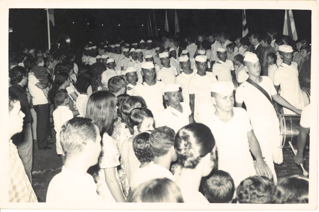 Registra o desfile de Bandas Marciais de Colégios da Cidade do Recife no campus da UFRPE durante solenidade na Universidade, em 1969. Esta fotografia ao lado das fotografias 0207 e 0208 integram uma minicoleção relacionada a esse tema. Vê-se uma banda marcial de um Colégio não identificado localizado na Cidade do Recife fazendo sua apresentação diante do prédio da reitoria da UFRPE. No lado esquerdo, observa-se o público, incluindo crianças, há 01 mastro com uma bandeira não identificada. No lado direito da fotografia, vê-se vários mastros com bandeiras e também a presença do público e também muitas crianças. Durante a entrevista para rememoração, ao observar a fotografia, o reitor Adierson falou: “Linda fotografia... A Rural passou a existir para a sociedade comigo sabe? A amizade que eu tinha com o governador e com os deputados.... Eu era amigo de Gilberto Freyre, isso facilitava tudo que se pensava em organizar. ”FONTES DE PESQUISA: Entrevista concedida às bibliotecárias Conceição Martins e Vania Ferreira para atender aos objetivos do Repositório Institucional, projeto “(Re) Memórias da UFRPE”, para a contextualização das imagens do acervo fotográfico do reitorado do Prof. Dr. Adierson Erasmo de Azevedo, no período de dezembro de 1969 a agosto de 1973. Acervo localizado no Núcleo do Conhecimento Professor João Baptista Oliveira dos Santos, da Biblioteca Central da UFRPE. Entrevista realizada no dia 29 de abril de 2016, no Espaço Santander da Biblioteca Central da UFRPE. Duração de 2h24min com transcrição da bibliotecária Conceição Martins.