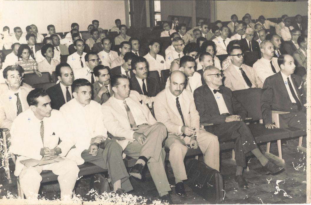 Retrata o público presente no salão nobre da UFRPE, durante a realização da solenidade promovida pelo Departamento de Zootecnia, presidida pelo Reitor Manoel Rodrigues Filho. Pode-se observar que o aludido salão nobre está com a maioria das suas cadeiras ocupadas por convidados, tais como, Francisco Maria Cavalcante Oliveira, superintendente substituto da SUDENE e o senhor Carlos Arcoverde, entre outros, e pelos professores da própria UFRPE: Jair Meireles, Eudes de Souza Leão Pinto, Espedito Meira Couceiro, Evaldo Cirne de Azevedo, José Ernesto Monteiro, Renato Ramos de Farias Filho, José Ferreira de Carvalho. Observa-se que representação masculina no evento é maior que a feminina, ratificando a realidade dos anos 1960, época em que as Ciências Agrárias demandavam maior quantitativo de homens, mesmo assim, vê-se cinco participantes femininas, duas sentadas no ângulo esquerdo da quarta fila, com cabelos curtos e as outras três sentadas na terceira fila, também de cabelos curtos, uma delas de cabeça baixa, usa óculos, a que aparece no centro está atenta à fala de alguém que discursa, enquanto a terceira aparece parcialmente. Vê-se ainda ao final das cadeiras que compõem o salão nobre, a porta de comunicação entre o mesmo e o hall que lhe dá acesso. Essa porta encontra-se aberta permitindo ver-se no ângulo direito da fotografia o sofá, as cortinas e outra porta de vidro que dá acesso ao corredor lateral. FONTES DE PESQUISA: Informações escritas a lápis e a caneta no verso da fotografia; PRÉDIO Reitoria da UFRPE: resgate histórico 1935-2009. Recife: UFRPE, 2009. 185 p.; UNIVERSIDADE RURAL DE PERNAMBUCO. Plaquete comemorativa do cinquentenário da Escola Superior de Agricultura da Universidade Rural de Pernambuco: 1812-1962. Recife: Imprensa Universitária da URP, 1962. PESQUISA COMPLEMENTAR: BOSI, CARDOSO, Maria Celene. A mulher e a profissão agronômica. Revista de Agricultura. Recife, n.1, p. 53-54, jul./ago. 1947; BOSI, Eclea. O tempo vivo da memória: ensaios de Psicologia Social. São Paulo: Ateliê Editorial, 2003.