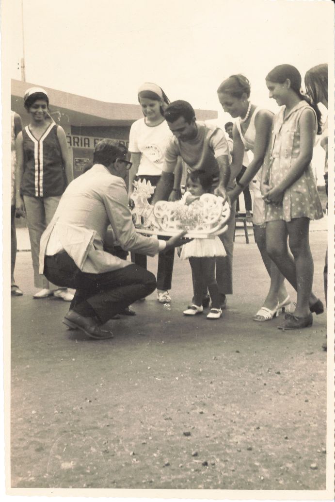 Destaca outro ângulo da visita do professor Adierson Erasmo de Azevedo, reitor da UFRPE ao Município do Salgueiro, localizado no Sertão de Pernambuco e mostra a carinhosa recepção da comunidade ao mesmo. Vê-se o reitor agachado recebendo uma homenagem da cidade que lhe está sendo entregue pela garotinha filha do casal que o está recepcionando ao lado de outras jovens mulheres. Observa-se que o presente se trata de algo tipo uma alegoria natalina, portanto, a viagem ocorreu no período próximo ao Natal. Durante a entrevista para rememoração, ao observar a fotografia, o reitor Adierson falou: “Rindo... Que felicidade rever essas fotografias! Eita que memória maravilhosa graças a Deus! Lembrou a Cidade! Sabe porque eu me lembro? Porque fui terminando meu discurso no carro, Gilson era o motorista naquele momento, ele dividia o horário com o outro motorista, o Baeta... Pena que ele faleceu há muito tempo... (Tristeza no olhar e na voz...) .... Então, a polícia rodoviária mandou parar nosso carro de repente porque tinha um acidente na estrada. Fiquei no carro finalizando o discurso quando o trânsito foi liberado seguimos a viagem e quando chegamos à entrada da cidade Gilson disse: “Doutor, atrás da gente tem 90 carros. Uma multidão...” Era o povo da cidade! Quando entrei na cidade fui aclamado como se fosse o Governador!!! Foi muito bonito ser recebido por aquele povo humilde e tão carinhoso.... Sabe o presente que recebi? Era um bolo bonito e saboroso! Todos que estávamos na comitiva comemos o bolo! (Risos!) Guardei na memória a emoção daquele dia...” FONTES DE PESQUISA: Entrevista concedida às bibliotecárias Conceição Martins e Vania Ferreira para atender aos objetivos do Repositório Institucional, projeto “(Re) Memórias da UFRPE”, para a contextualização das imagens do acervo fotográfico do reitorado do Prof. Dr. Adierson Erasmo de Azevedo, no período de dezembro de 1969 a agosto de 1973. Acervo localizado no Núcleo do Conhecimento Professor João Baptista Oliveira dos Santos, da Biblioteca Central da UFRPE. Entrevista realizada no dia 29 de abril de 2016, no Espaço Santander da Biblioteca Central da UFRPE. Duração de 2h24min com transcrição da bibliotecária Conceição Martins.