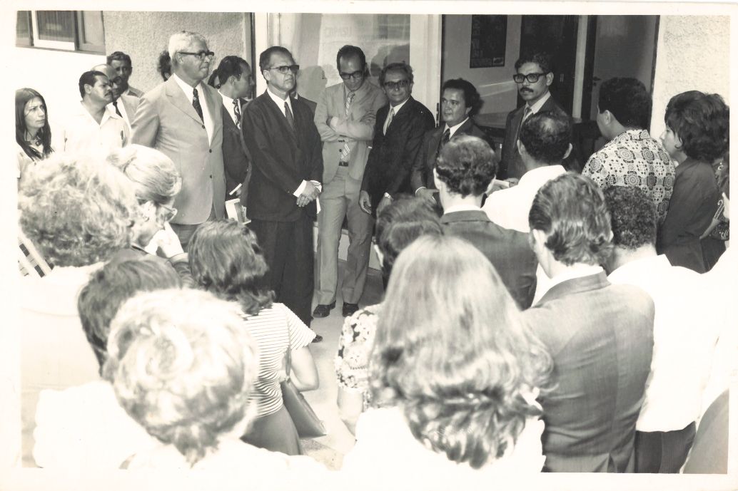 Registra o momento posterior ao corte a fita da inauguração da Imprensa Universitária e capta o pronunciamento do professor Adierson Erasmo de Azevedo reitor da UFRPE. Presentes diversas autoridades, convidados e componentes da universidade, com destaque para o professor Murilo Salgado Carneiro, vice-reitor da UFRPE. Durante a entrevista para rememoração, ao observar a fotografia, o reitor Adierson falou: “... (Observando...) Aqui está Murilo Salgado, meu vice-reitor, estávamos do lado de fora do prédio, na entrada... Eu estava fazendo um pequeno discurso...Vejam quanto é importante o registro fotográfico, guardam os momentos do presente para as gerações do futuro. Repito que essas fotos contam a história da Editora. Naquela época a Imprensa Universitária ficava no bloco menor no final da ala do prédio da reitoria, na ponta direita de quem está na reitoria ou a ponta esquerda de quem vai até lá. É uma pena que não consigo lembrar quem são essas pessoas que estiveram naquele momento... (Tamborilando)... É, não consigo lembrar, mas é muito bom rever essas imagens.” FONTES DE PESQUISA: Entrevista concedida às bibliotecárias Conceição Martins e Vania Ferreira para atender aos objetivos do Repositório Institucional, projeto “(Re) Memórias da UFRPE”, para a contextualização das imagens do acervo fotográfico do reitorado do Prof. Dr. Adierson Erasmo de Azevedo, no período de dezembro de 1969 a agosto de 1973. Acervo localizado no Núcleo do Conhecimento Professor João Baptista Oliveira dos Santos, da Biblioteca Central da UFRPE. Entrevista realizada no dia 27 de abril de 2016, no Espaço Santander da Biblioteca Central da UFRPE. Duração de 2h17min com transcrição e pesquisa complementar da bibliotecária Conceição Martins.
