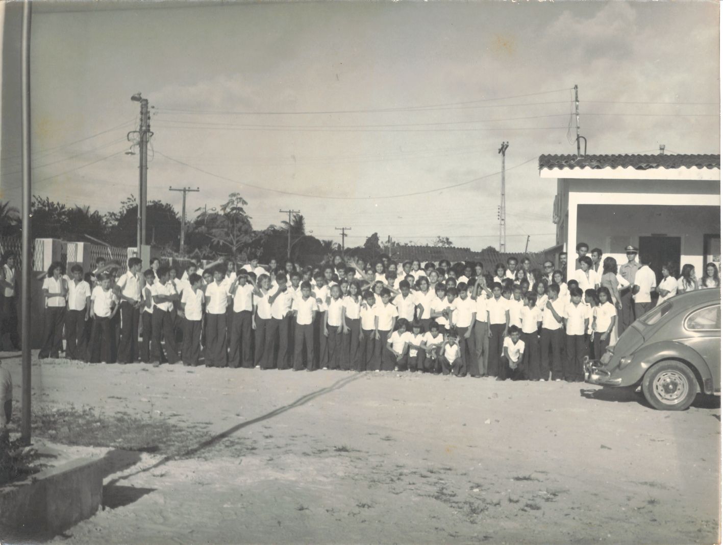 Revela a vacinação infantil realizada durante a Jornada Universitária de Salgueiro, Pernambuco. Como não possui uma data especificada adotamos o ano de 1971 como a data em que foi registrada. A fotografia apresenta uma enfermeira aplicando vacina em uma menina observada por outras crianças. Vê-se no lado esquerdo da fotografia, um homem de pé olhando diretamente para a câmera fotográfica. Sobre a mesa além de uma bolsa, há uma jarra de água, um suporte em isopor e outros itens de uso no processo da vacinação. Durante a entrevista para rememoração, ao observar a fotografia, o reitor Adierson falou: “Vejam como a comunidade de Salgueiro estava empolgada e na expectativa para vacinar suas crianças. Todas as escolas estavam aguardando a comitiva da UFRPE”. FONTES DE PESQUISA: Entrevista concedida às bibliotecárias Conceição Martins e Vania Ferreira para atender aos objetivos do Repositório Institucional, projeto “(Re) Memórias da UFRPE”, para a contextualização das imagens do acervo fotográfico do reitorado do Prof. Dr. Adierson Erasmo de Azevedo, no período de dezembro de 1969 a agosto de 1973. Acervo localizado no Núcleo do Conhecimento Professor João Baptista Oliveira dos Santos, da Biblioteca Central da UFRPE. Entrevista realizada no dia 04 de maio de 2016, no setor de Normalização da Biblioteca Central da UFRPE. Duração de 2h32min22seg. com transcrição e pesquisa complementar da bibliotecária Conceição Martins.
