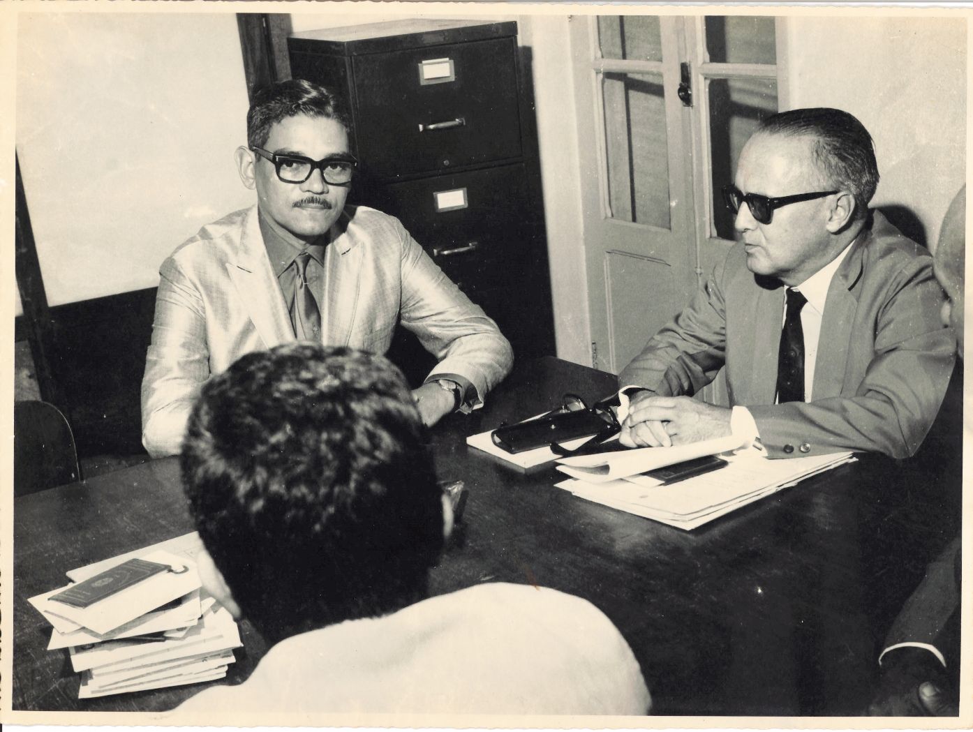 UNIVERSIDADE FEDERAL RURAL DE PERNAMBUCO. Professor Adierson Erasmo de Azevedo, Reitor da UFRPE, durante reunião para obter vistos em passaportes – Parte 3. Fotografia, revelada em papel brilhante, em sépia, 25 cm X 18 cm.