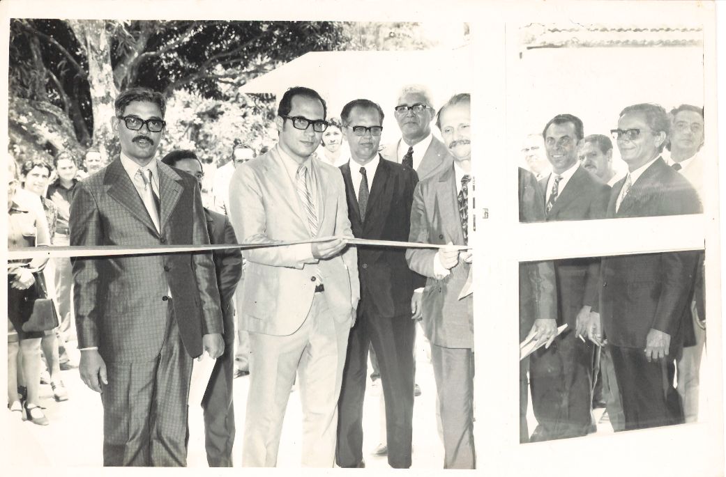 Registra o momento do corte da fita para o acesso às novas instalações, da Imprensa Universitária. Vê-se o professor Adierson Erasmo de Azevedo e o professor Murilo Salgado, respectivamente, reitor e vice-reitor da UFRPE, acompanhados entre outras autoridades pelo professor Petronilo Santa Cruz, Corinto Ferreira da Paz, diretor da Imprensa Universitária e o prefeito de São Lourenço, José Lapenda Filho. Observa-se ainda, outras pessoas acompanhando a inauguração. Durante a entrevista para rememoração, ao observar a fotografia, o reitor Adierson falou: “A Imprensa Universitária já existia e funcionava sob a coordenação de um servidor muito dedicado... não lembro o nome dele agora... mas a Imprensa Universitária necessitava de condições melhores. Naquele ano de 1971, recebi a visita do advogado Corinto Ferreira da Paz, que veio de Maceió ao Recife para uma reunião comigo, durante nossa conversa soube que ele tinha sido diretor de colégio durante muitos anos e tinha experiência administrativa, o convidei para diretor da Imprensa Universitária e ele aceitou. Conversei com o servidor... se não me engano o nome dele era Brás...não tenho certeza... que lá trabalhava e era muito dedicado e deixe-o como vice-diretor da Imprensa. Então a equipe ficou assim: Corinto, diretor e responsável pela parte administrativa e o servidor que não lembro o nome, vice-diretor e responsável pela parte técnica das máquinas. Pronto e assim os trabalhos continuaram acontecendo com melhor qualidade.” FONTES DE PESQUISA: Entrevista concedida às bibliotecárias Conceição Martins e Vania Ferreira para atender aos objetivos do Repositório Institucional, projeto “(Re) Memórias da UFRPE”, para a contextualização das imagens do acervo fotográfico do reitorado do Prof. Dr. Adierson Erasmo de Azevedo, no período de dezembro de 1969 a agosto de 1973. Acervo localizado no Núcleo do Conhecimento Professor João Baptista Oliveira dos Santos, da Biblioteca Central da UFRPE. Entrevista realizada no dia 27 de abril de 2016, no Espaço Santander da Biblioteca Central da UFRPE. Duração de 2h17min com transcrição e pesquisa complementar da bibliotecária Conceição Martins.