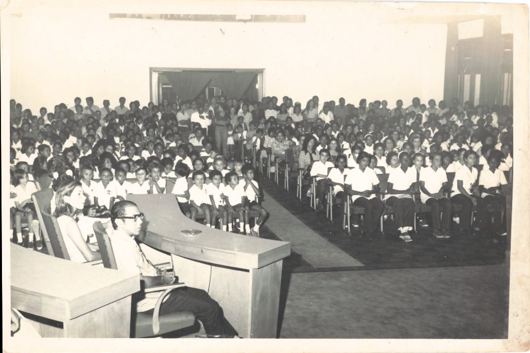 Retrata uma atividade cultural realizada no salão nobre da UFRPE da qual alunos da Escola Lions Parnamirim, localizada no entorno dessa Universidade no bairro de Dois Irmãos, Recife, Pernambuco. Tem-se uma visão geral das cadeiras destinadas ao público no salão nobre que se encontra lotado por crianças, em sua maioria trajando uniforme escolar. Observa-se na primeira fila da ala esquerda crianças bem pequenas enquanto na primeira fila da ala direita aparecem crianças maiores. Na borda inferior da fotografia, vê-se no lado esquerdo, parte da bancada destinada ao Conselho Universitário, onde se encontram sentados 02 professores não identificados e ambos, tal qual os alunos, observam atentamente a atividade que acontece no palco do salão nobre. No fundo do salão vê-se, a porta, diante da qual aparecem dispostas 02 cortinas. Acima dela, no primeiro andar, aparece a borda do janelão da reitoria que mostra a visão do salão nobre para aqueles que ali se encontram. Enquanto isso, em toda a parede final do salão encontram-se diversos adultos de pé. É possível observar no lado direito da fotografia 02 portas laterais de vidro que dão acesso ao corredor do prédio da reitoria.Durante a entrevista para rememoração, ao observar a fotografia, o reitor Adierson falou: “Aqui são os alunos da Escola Lions Parnamirim que forma convidados e vieram para cá acompanhados por seus professores... Não lembro seus nomes... Uma pena”. FONTES DE PESQUISA: Entrevista concedida às bibliotecárias Conceição Martins e Vania Ferreira para atender aos objetivos do Repositório Institucional, projeto “(Re) Memórias da UFRPE”, para a contextualização das imagens do acervo fotográfico do reitorado do Prof. Dr. Adierson Erasmo de Azevedo, no período de dezembro de 1969 a agosto de 1973. Acervo localizado no Núcleo do Conhecimento Professor João Baptista Oliveira dos Santos, da Biblioteca Central da UFRPE. Entrevista realizada no dia 29 de abril de 2016, no Espaço Santander da Biblioteca Central da UFRPE. Duração de 2h24min com transcrição da bibliotecária Conceição Martins.