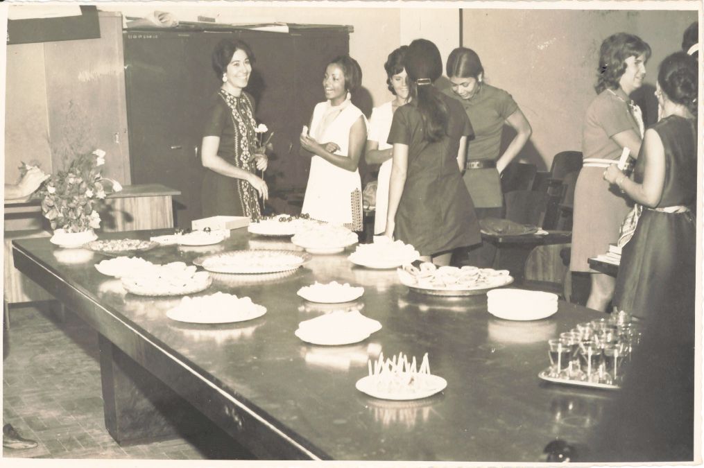 Documenta outro ângulo da comemoração do aniversário do Reitor realizada no Departamento de Economia Doméstica no ano de 1969. Vendo-se as professoras presentes à comemoração conversando entre si, assim como a mesa com os doces, salgados e refrigerantes. Observa-se também no recanto esquerdo da mesa o vaso com as rosas ofertadas pelo reitor às participantes. Observa-se ainda na parede posterior da sala um armário e sobre ele encontram-se alguns cartazes.Durante a entrevista para rememoração, ao observar a fotografia, o reitor Adierson falou: “Essas moças eram professoras do Curso de Economia Doméstica.... Não lembro seus nomes. Como falei anteriormente, minha esposa, Líbia, ciente dessa comemoração, organizou uma forma de eu agradecer as homenagens que iria receber, então levou um vaso com rosas que colocou num canto da mesa e a cada presente que eu recebia das professoras participantes, eu lhes entregava uma rosa! (Risos...) ... (Observando) Foi uma tarde maravilhosa!”FONTES DE PESQUISA: Entrevista concedida às bibliotecárias Conceição Martins e Vania Ferreira para atender aos objetivos do Repositório Institucional, projeto “(Re) Memórias da UFRPE”, para a contextualização das imagens do acervo fotográfico do reitorado do Prof. Dr. Adierson Erasmo de Azevedo, no período de dezembro de 1969 a agosto de 1973. Acervo localizado no Núcleo do Conhecimento Professor João Baptista Oliveira dos Santos, da Biblioteca Central da UFRPE. Entrevista realizada no dia 29 de abril de 2016, no Espaço Santander da Biblioteca Central da UFRPE. Duração de 2h24min com transcrição da bibliotecária Conceição Martins.