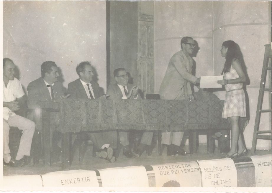 Sequência da solenidade de outorga de certificados do Treinamento de Aluno Instrutor para o Projeto Euclides da Cunha, realizada no Colégio Agrícola Dom Agostinho Ikas – Codai, em São Lourenço da Mata. Como não possui uma data especificada adotamos o ano de 1971 como a data em que foi registrada. Na fotografia, observa-se que o evento aconteceu em um auditório, onde aparece acima do público, sobre uma espécie de tablado, a mesa de das autoridades. Registra o momento em que o professor cujo nome não foi identificado, encontra-se de pé, entregando o certificado a uma aluna concluinte do Treinamento. Enquanto isso, sentados à mesa vê-se da esquerda para a direita da fotografia, os professores Paulo Barretto Campello, Luiz de Góes Vieira, Júlio Fernandes, o professor Isaias Vasconcelos e o professor Almir Pires Ferreira que ficou meio escondido no ângulo final da mesa. Todos aplaudem com entusiasmo. É possível ver uma série de cartazes colados na base do tablado, assim como na escada que se encontra localizada no lado direito da fotografia. Durante a entrevista para rememoração, ao observar a fotografia, o reitor Adierson falou: “Vejam que beleza essa aluna concluindo treinamento... Ela foi capacitada para exercer a atividade de aluna instrutora do Projeto Euclides da Cunha, uma excelente atividade extensionista da UFRPE. Esses professores eram os responsáveis pelas respectivas disciplinas do curso. Repito que reconheço Paulo Barreto Campello, Luiz de Góes Vieira, Júlio Fernandes, Isaias Vasconcelos... Esse quinto aqui sei quem era, mas não lembro o nome e esse último era Almir Pires Ferreira. Eita saudade!!!!”. FONTES DE PESQUISA: Entrevista concedida às bibliotecárias Conceição Martins e Vania Ferreira para atender aos objetivos do Repositório Institucional, projeto “(Re) Memórias da UFRPE”, para a contextualização das imagens do acervo fotográfico do reitorado do Prof. Dr. Adierson Erasmo de Azevedo, no período de dezembro de 1969 a agosto de 1973. Acervo localizado no Núcleo do Conhecimento Professor João Baptista Oliveira dos Santos, da Biblioteca Central da UFRPE. Entrevista realizada no dia 04 de maio de 2016, no setor de Normalização da Biblioteca Central da UFRPE. Duração de 2h32min22seg. com transcrição e pesquisa complementar da bibliotecária Conceição Martins.