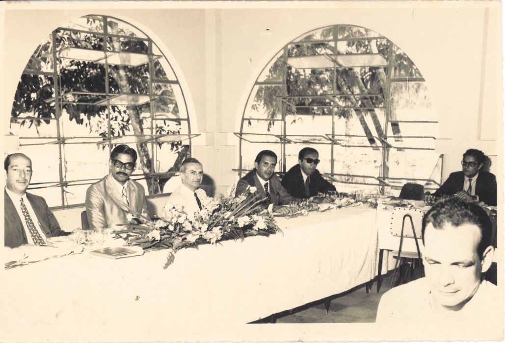 Retrata a primeira fotografia de uma minicoleção composta pelas imagens 0236 e 0237 relacionadas a um almoço de confraternização promovido pela UFRPE no restaurante do Horto de Dois Irmãos. Nesse ângulo, pode-se observar que se encontram sentados às 03 mesas, 07 homens, vendo-se na primeira delas, que aparece bem-posta com arranjo floral encontra-se o reitor Adierson Erasmo de Azevedo, os professores Eudes de Souza Leão Pinto, e Airton do Departamento de Pesca e mais 02 outras autoridades não identificadas. No lado direito da fotografia, na segunda mesa que aparece ao fundo, encontra-se outro homem e ainda nesse lado direito, na borda inferior, há uma terceira mesa na qual aparece mais outro homem. Olhando-se de forma ampla, observa-se 02 janelões que se abrem para um pátio arborizado. Durante a entrevista para rememoração, ao observar a fotografia, o reitor Adierson falou: “Aqui estou eu, professor Eudes de Souza Leão Pinto está aqui juntinho de mim e Airton é esse que está todo de branco ao meu lado. (Observando...) Faz muito tempo minhas filhas, não lembro os nomes dos outros”. FONTES DE PESQUISA: Entrevista concedida às bibliotecárias Conceição Martins e Vania Ferreira para atender aos objetivos do Repositório Institucional, projeto “(Re) Memórias da UFRPE”, para a contextualização das imagens do acervo fotográfico do reitorado do Prof. Dr. Adierson Erasmo de Azevedo, no período de dezembro de 1969 a agosto de 1973. Acervo localizado noNúcleo do Conhecimento Professor João Baptista Oliveira dos Santos , da Biblioteca Central da UFRPE. Entrevista realizada no dia 29 de abril de 2016, no Espaço Santander da Biblioteca Central da UFRPE. Duração de 2h24min com transcrição da bibliotecária Conceição Martins.