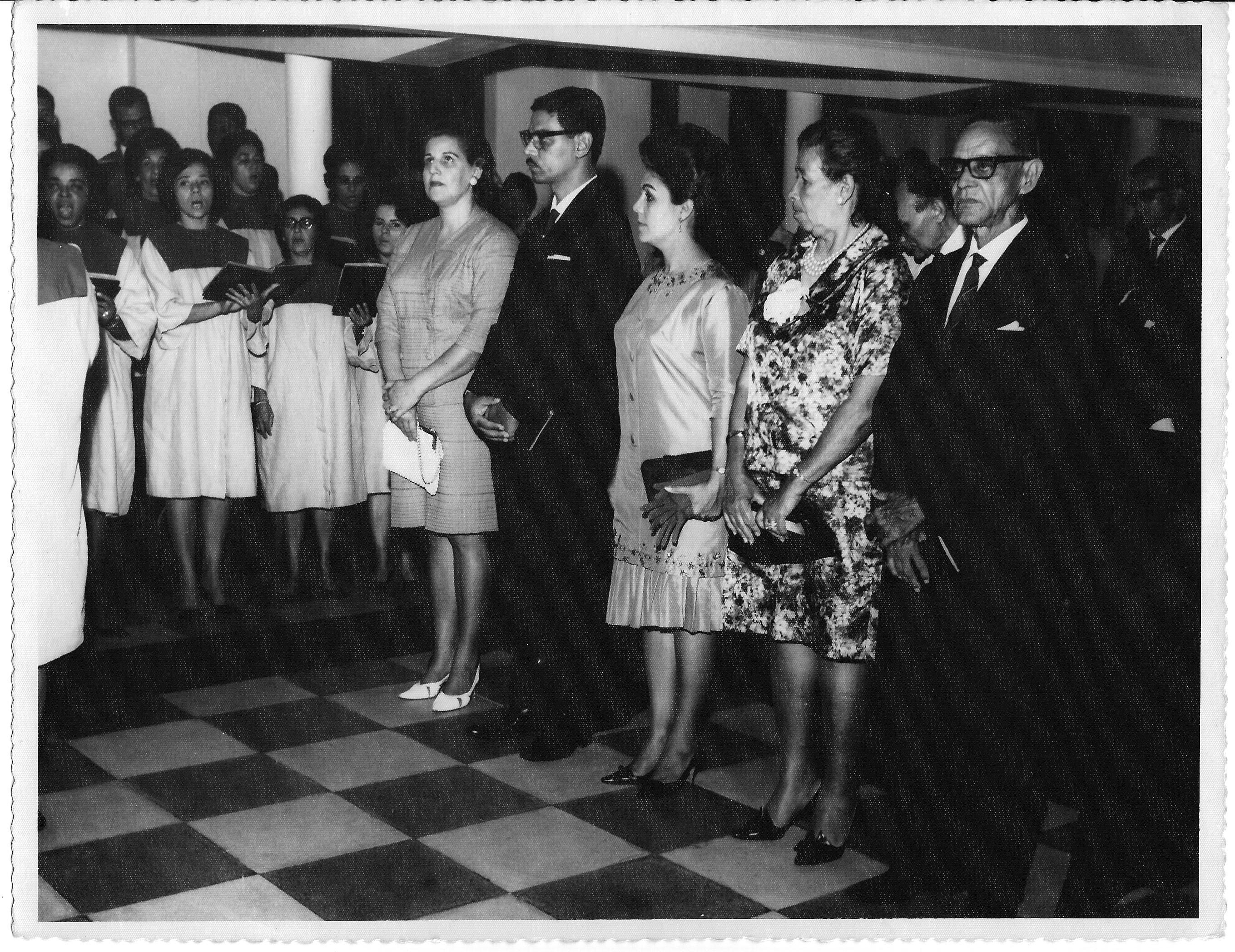 Registra o Culto em Ação de Graças pela posse como reitor da UFRPE, em 1969 e retrata o Professor Adierson Erasmo de Azevedo ao lado da família, todos elegantemente trajados, durante o Culto em Ação de Graças pela sua nomeação como reitor da UFRPE, realizado na Igreja Batista da Capunga, Parque Amorim, Recife, Pernambuco. Vê-se ao seu lado esquerdo: a Senhora Líbia Azevedo, sua esposa; a Professora Celina Azevedo, sua mãe, que lecionava inglês; e o Professor Mário Azevedo, seu pai, que lecionou inglês e francês na Escola Superior de Agricultura, localizada no Engenho São Bento em Tapera, Pernambuco. À sua direita: a esposa de um pastor amigo, além do Coral da Igreja Batista da Capunga. FONTES DE PESQUISA: Entrevista concedida às bibliotecárias Conceição Martins e Vania Ferreira para atender aos objetivos do Repositório Institucional, projeto “(Re) Memórias da UFRPE”, para a contextualização das imagens do acervo fotográfico do reitorado do Prof. Dr. Adierson Erasmo de Azevedo, no período de dezembro de 1969 a agosto de 1973, localizado no Núcleo do Conhecimento Professor João Baptista Oliveira dos Santos da Biblioteca Central da UFRPE. Entrevista realizada no dia 13 de abril de 2016, no Espaço Santander da Biblioteca Central da UFRPE. Duração de 2h40min com transcrição e pesquisa complementar da bibliotecária Conceição Martins; Plaquete Mérito Agronômico 2004. Recife: APCA, 2004. 98 p.; AZEVEDO, Adierson Erasmo de. A “caminhada seguindo o sol” da Universidade Federal Rural de Pernambuco. Recife: EDUFERPE, 2007. 147 p.