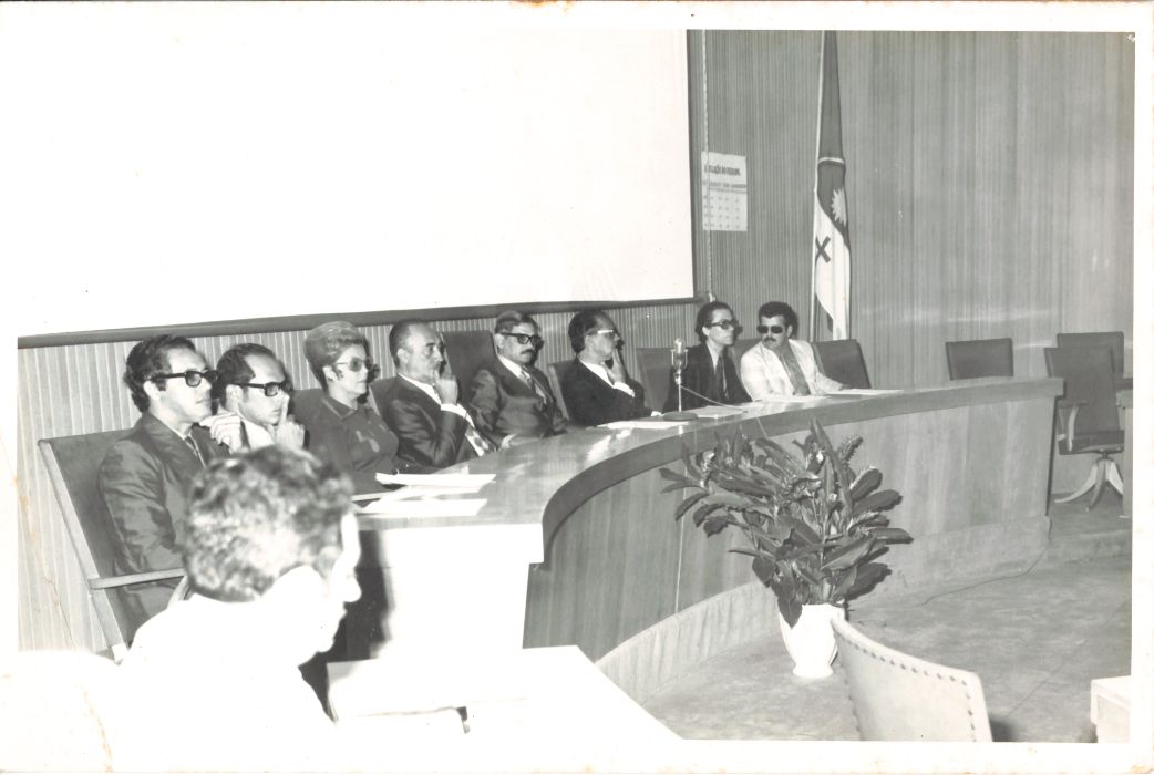 Evento realizado no salão nobre da UFRPE. Registra uma solenidade realizada no salão nobre da UFRPE, sem identificação do evento e nem do ano, vendo-se a mesa diretora, uma tela branca enorme e a bandeira de Pernambuco. Na mesa diretora, vê-se o reitor Adierson ladeado por professores e outras autoridades. É possível identificar o professor Murilo Salgado ao lado esquerdo do reitor, porém, as duas autoridades que aparecem ao seu lado não são possíveis identificar. No lado direito do reitor, vê-se o professor Luís de Goes do Departamento de Educação, da área de Extensão Rural e o professor Antônio Gondim Lóssio.do Departamento de Medicina Veterinária. Durante a rememoração o reitor Adierson lamentou não lembrar os nomes dessas pessoas, contudo, é normal, afinal são muito anos de distância no tempo. FONTES DE PESQUISA: Entrevista concedida às bibliotecárias Conceição Martins e Vania Ferreira para atender aos objetivos do Repositório Institucional, projeto “(Re) Memórias da UFRPE”, para a contextualização das imagens do acervo fotográfico do reitorado do Prof. Dr. Adierson Erasmo de Azevedo, no período de dezembro de 1969 a agosto de 1973. Acervo localizado no Núcleo do Conhecimento Professor João Baptista Oliveira dos Santos, da Biblioteca Central da UFRPE. Entrevista realizada no dia 13 de abril de 2016, no Espaço Santander da Biblioteca Central da UFRPE. Duração de 2h40min com transcrição e pesquisa complementar da bibliotecária Conceição Martins. AZEVEDO, Adierson Erasmo de. A “Caminhada seguindo o Sol” da Universidade Federal Rural de Pernambuco. Recife: Editora UFRPE, 2007.