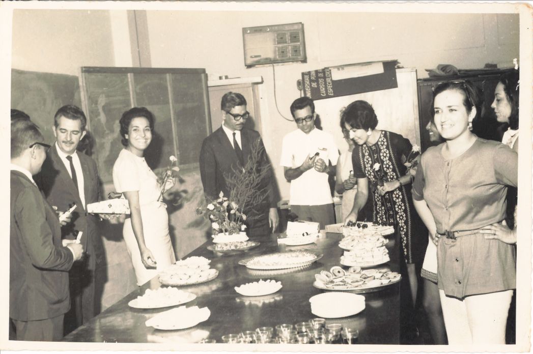 Registra a continuação da comemoração do aniversário do Reitor realizada no Departamento de Economia Doméstica no ano de 1969. Vê-se o reitor Adierson Erasmo de Azevedo, o aniversariante, sorridente recebendo os cumprimentos dos amigos professores Luiz de Góes, Evaldo Cirne de Azevedo e Marcos Cavalcanti Diniz, tendo ao seu lado esquerdo, Maria Clara, bibliotecária da Biblioteca Central, que sorridente traz em suas mãos uma rosa que lhe foi ofertada pelo reitor. Vê- se à direita da mesa de doces e salgados, um vaso contendo rosas que serão entregues pelo aniversariante às participantes. Logo a seguir, ao lado reitor, vê-se um professor não identificado e 05 professoras não identificadas. Observa-se que do lado esquerdo da sala atrás do reitor, há um quadro de giz e um quadro de avisos, após ele aparece um armário de aço sobre o qual há material não identificado. Nessa parede, existe um aparelho de ar-condicionado e abaixo dele, um armário e sobre ele encontram-se alguns cartazes. Há também uma espécie birô ou mesa. Durante a entrevista para rememoração, ao observar a fotografia, o reitor Adierson falou: “Ah! (Risos) .... Que maravilha, nessa fotografia a maioria das pessoas está sorrindo! Que alegria!!! (Risos) .... Essas moças eram professoras do Curso de Economia Doméstica.... Não lembro seus nomes. Como já falei, minha esposa, Líbia, ciente dessa comemoração, organizou uma forma de eu agradecer as homenagens que iria receber, então levou um vaso com rosas que colocou num canto da mesa e a cada presente que eu recebia das professoras participantes, eu lhes entregava uma rosa! (Risos...). Foi bem emocionante! (Observando) .... Que beleza ver essas fotos!A gente fica capaz de chorar de alegria... (Risos emocionados).”FONTES DE PESQUISA: Entrevista concedida às bibliotecárias Conceição Martins e Vania Ferreira para atender aos objetivos do Repositório Institucional, projeto “(Re) Memórias da UFRPE”, para a contextualização das imagens do acervo fotográfico do reitorado do Prof. Dr. Adierson Erasmo de Azevedo, no período de dezembro de 1969 a agosto de 1973. Acervo localizado no Núcleo do Conhecimento Professor João Baptista Oliveira dos Santos, da Biblioteca Central da UFRPE. Entrevista realizada no dia 29 de abril de 2016, no Espaço Santander da Biblioteca Central da UFRPE. Duração de 2h24min com transcrição da bibliotecária Conceição Martins.