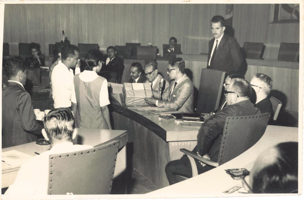 Registra o Concurso Bíblico Regional realizado no salão nobre da UFRPE, em 11 de julho de 1971. Nessa fotografia, vê-se o professor Adierson Erasmo de Azevedo, reitor da UFRPE, sentado na bancada do salão nobre, local utilizado pelos membros do Conselhos Universitário, tem diante de si o microfone e ao seu lado esquerdo, três professores trajando paletó e gravata, dois deles usando óculos. O reitor e o professor ao seu lado direito, verificam um pacote, provavelmente, relacionado às provas que seriam aplicadas aos candidatos. Enquanto isso, o terceiro professor, lê um documento e faz algum comentário enquanto sorri. Sobre essa bancada, encontram-se dispostas várias publicações. Observa-se de pé, atrás da mesma bancada, o professor Luiz de Góes Vieira trajando terno completo. Diante do professor Adierson Erasmo de Azevedo, reitor da UFRPE, encontram-se, de pé, uma moça usando blusa branca sob uma jardineira em outra cor ao lado de um homem trajando camisa branca que leva a mão à boca. Ambos olham para os professores e para o reitor sentados observando o pacote. No lado direito da fotografia, encontram-se sentados três homens cujas categorias não foram possíveis ser identificadas. Os mesmos também observam a mesma bancada onde estão o professor Adierson, ao lado dos dois outros professores observando o pacote. No ângulo inferior direito, vê-se parte de outra bancada onde aparece parcialmente a cabeça de um homem usando óculos. No centro da fotografia, há outra bancada onde se encontra sentado um homem de costas para o fotógrafo olhando na direção do reitor. Sobre a mesma, observa-se uma folha de papel com um texto escrito e parte de uma caneta. Observa-se, no lado esquerdo da imagem, a presença de um servidor de apoio segurando uma bandeja com xícaras para serviço de café. Observa-se também três alunas, a mais alta, trajando roupa bege e calçando sapato baixo, olha diretamente para a objetiva, enquanto segura um papel na mão direita. Durante a entrevista para rememoração, ao observar a fotografia, o reitor Adierson falou: “Esse foi um concurso muito importante para a Igreja e a UFRPE se dispôs a dar apoio. Ao meu lado vejo dois colegas professores... Infelizmente, agora não estou lembrando o nome desse que está sentado ao meu lado, mas vejo ao lado dele o professor Renato Ramos de Farias, ex-reitor da nossa universidade”. FONTES DE PESQUISA: Entrevista concedida às bibliotecárias Conceição Martins e Vania Ferreira para atender aos objetivos do Repositório Institucional, projeto “(Re) Memórias da UFRPE”, para a contextualização das imagens do acervo fotográfico do reitorado do Prof. Dr. Adierson Erasmo de Azevedo, no período de dezembro de 1969 a agosto de 1973. Acervo localizado no Núcleo do Conhecimento Professor João Baptista Oliveira dos Santos, da Biblioteca Central da UFRPE. Entrevista realizada no dia 04 de maio de 2016, no setor de Normalização da Biblioteca Central da UFRPE. Duração de 2h32min22seg, com transcrição e pesquisa complementar da bibliotecária Conceição Martins.