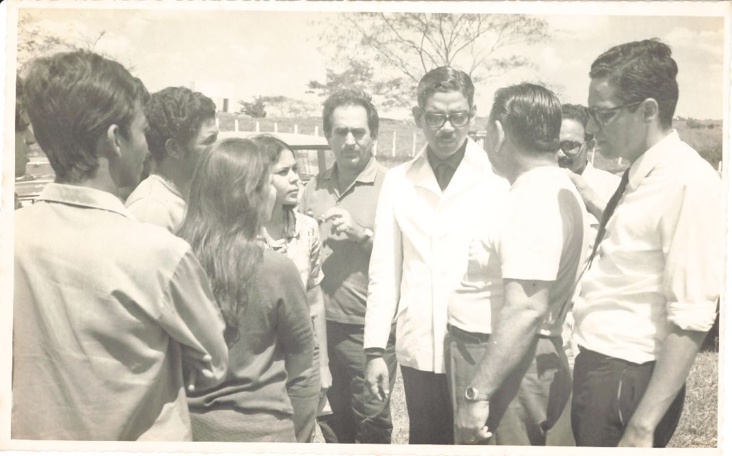 Retrata o leilão de gado realizado na Fazenda Agropastoril da UFRPE localizada em São Bento, Tapera, no Município de São Lourenço da Mata, Pernambuco, em 30 de setembro de 1971. Nela, vê-se o professor Adierson Erasmo de Azevedo, reitor da UFRPE, usando traje esportivo conversando com um grupo de 09 pessoas, entre eles, 02 mulheres. No ângulo posterior da fotografia pode-se observar o campo com um cercado e uma árvore No ângulo superior ao fundo da fotografia, é possível ver um grupo masculino. Durante a entrevista para rememoração, ao observar a fotografia, o reitor Adierson falou: “Esse leilão foi muito bem organizado e teve uma participação do público muito expressiva... Foi um dos eventos de destaque do meu reitorado”. FONTES DE PESQUISA: Entrevista concedida às bibliotecárias Conceição Martins e Vania Ferreira para atender aos objetivos do Repositório Institucional, projeto “(Re) Memórias da UFRPE”, para a contextualização das imagens do acervo fotográfico do reitorado do Prof. Dr. Adierson Erasmo de Azevedo, no período de dezembro de 1969 a agosto de 1973. Acervo localizado no Núcleo do Conhecimento Professor João Baptista Oliveira dos Santos, da Biblioteca Central da UFRPE. Entrevista realizada no dia 04 de maio de 2016, no setor de Normalização da Biblioteca Central da UFRPE. Duração de 2h32min22seg, com transcrição e pesquisa complementar da bibliotecária Conceição Martins.
