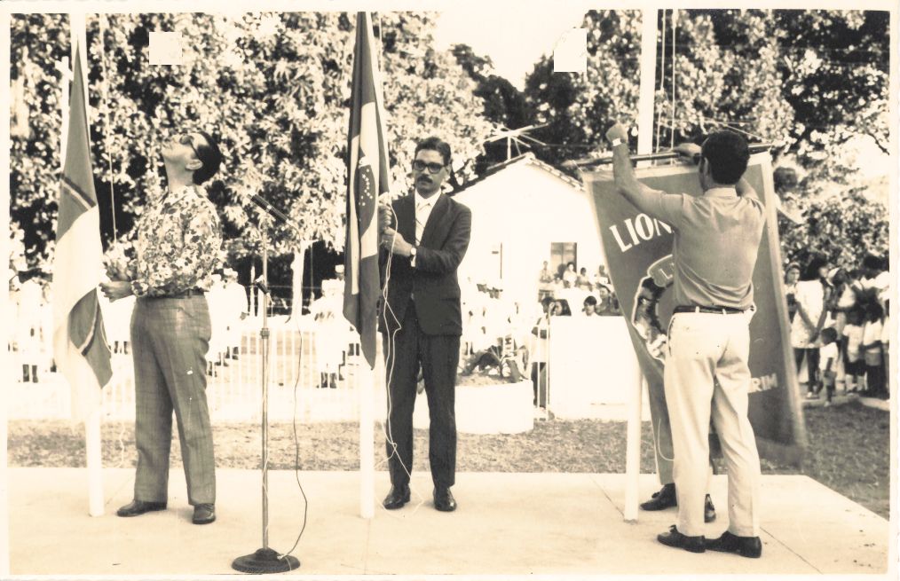 Registra a segunda fotografia relativa ao hasteamento das bandeiras durante a solenidade de inauguração da Escola Lions Recife Parnamirim, construída com recursos angariados pelo Lions Clube Recife Parnamirim Distrito L14, em terreno cedido pela Universidade Federal Rural de Pernambuco, ocorrida no dia 28 de agosto de 1971. Na fotografia, vê-se ao centro, o reitor Adierson Erasmo de Azevedo com a bandeira do Brasil, ao seu lado direito, há um professor com a bandeira de Pernambuco e ao seu lado esquerdo, outro professor com a bandeira do Lions Clube Parnamirim. No espaço de traz, observa-se várias árvores, uma casa, a banda do corpo de marinheiros e muitas pessoas, inclusive crianças. Durante a entrevista para rememoração, ao observar a fotografia, o reitor Adierson falou: “A Escola Lions Parnamirim foi muito importante para a comunidade. Não lembro os nomes desses professores que estavam ao meu lado também hasteando as bandeiras”. FONTES DE PESQUISA: Entrevista concedida às bibliotecárias Conceição Martins e Vania Ferreira para atender aos objetivos do Repositório Institucional, projeto “(Re) Memórias da UFRPE”, para a contextualização das imagens do acervo fotográfico do reitorado do Prof. Dr. Adierson Erasmo de Azevedo, no período de dezembro de 1969 a agosto de 1973. Acervo localizado no Núcleo do Conhecimento Professor João Baptista Oliveira dos Santos, da Biblioteca Central da UFRPE. Entrevista realizada no dia 04 de maio de 2016, no setor de Normalização da Biblioteca Central da UFRPE. Duração de 2h32min22seg. com transcrição e pesquisa complementar da bibliotecária Conceição Martins.