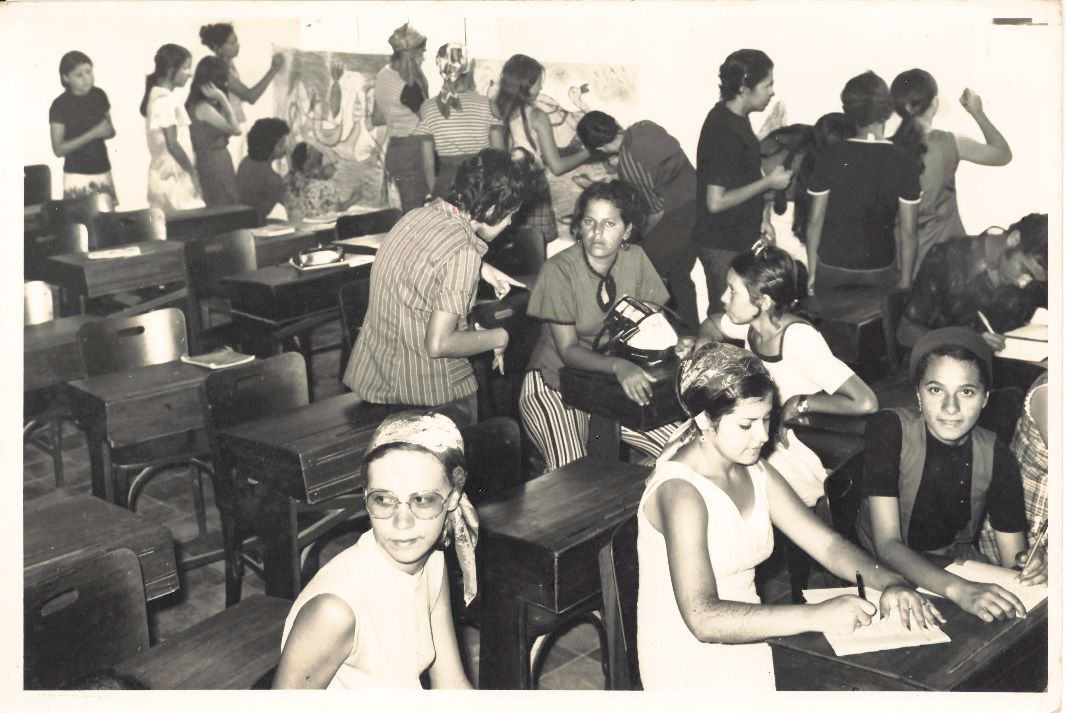 Documenta uma turma composta por 22 mulheres participantes do curso de Economia Doméstica para a comunidade realizando de atividades diversas. A fotografia não identifica a comunidade nem o local que estava recebendo essa Jornada Universitária da UFRPE, também não possui uma data especificada, sendo assim, adotamos o ano de 1971 como a data em que foi registrada. Essa Jornada Universitária, também foi coordenada pelo professor Marcos Cavalcanti Diniz com a colaboração do professor Paulo de Moraes Marques. Observa-se que algumas participantes encontram-se escrevendo, outras conversam entre si, enquanto outras estão de pé diante uma parede onde estão pintando, desenhando, enfim, criando painéis os quais possivelmente deverão ser apresentados para toda a turma. Durante a entrevista para rememoração, ao observar a fotografia, o reitor Adierson falou: “Que maravilha! Repito que essas Jornadas foram excelentes ações excelente... É sempre bom lembrar e me deixa emocionado... Pena que não reconhecer ninguém!”. FONTES DE PESQUISA: Entrevista concedida às bibliotecárias Conceição Martins e Vania Ferreira para atender aos objetivos do Repositório Institucional, projeto “(Re) Memórias da UFRPE”, para a contextualização das imagens do acervo fotográfico do reitorado do Prof. Dr. Adierson Erasmo de Azevedo, no período de dezembro de 1969 a agosto de 1973. Acervo localizado no Núcleo do Conhecimento Professor João Baptista Oliveira dos Santos, da Biblioteca Central da UFRPE. Entrevista realizada no dia 29 de abril de 2016, no Espaço Santander da Biblioteca Central da UFRPE. Duração de 2h24min com transcrição da bibliotecária Conceição Martins. PESQUISA COMPLEMENTAR realizada pela Bibliotecária Conceição Martins: As Jornadas Universitárias eram coordenadas pelo professor Marcos Diniz, diretor da Coordenação de Atividades de Extensão – COATE, e pelo professor Paulo de Moraes Marques, ambos da Extensão Universitária. A COATE foi a célula mater da atual Pró-Reitoria de Extensão, Cultura e Cidadania. Maiores informações, consultar: Azevedo, Adierson Erasmo de. A “caminhada seguindo o sol” da Universidade Federal Rural de Pernambuco. Recife: EDUFERPE, 2007. 147 p.; Paulo de Moraes Marques: memórias de um Extensionista rural. Recife: EDUFERPE, 2018. Disponível em: http://www.editora.ufrpe.br/Paulo_de_Moraes_Marques.
