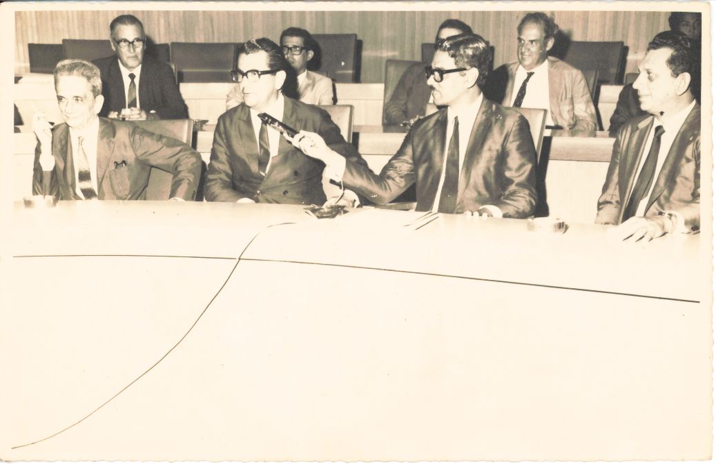 Fotografia que registra a Conferência do Ministro da Educação, Dr. Jarbas Passarinho na UFRPE, realizada no salão nobre da UFRPE, vendo-se sentados na primeira posição da bancada do Conselho Universitário, o reitor Adierson segurando o microfone para o palestrante, o Ministro da Educação, Professor Jarbas Passarinho, aparecem ainda o reitor da Universidade Federal de Pernambuco (UFPE), professor Marcionilo Lins, os Professores Ivan Tavares, Júlio Fernandes, Pedro Correia, o Coronel César Carls e outra pessoa não identificada. Durante a rememoração, o reitor comentou: “A UFPE, nossa coirmã, sempre foi assim”. FONTES DE PESQUISA: Entrevista concedida às bibliotecárias Conceição Martins e Vania Ferreira para atender aos objetivos do Repositório Institucional, projeto “(Re) Memórias da UFRPE”, para a contextualização das imagens do acervo fotográfico do reitorado do Prof. Dr. Adierson Erasmo de Azevedo, no período de dezembro de 1969 a agosto de 1973. Acervo localizado no Núcleo do Conhecimento Professor João Baptista Oliveira dos Santos , da Biblioteca Central da UFRPE. Entrevista realizada no dia 13 de abril de 2016, no Espaço Santander da Biblioteca Central da UFRPE. Duração de 2h40min com transcrição e pesquisa complementar da bibliotecária Conceição Martins. AZEVEDO, Adierson Erasmo de. A “Caminhada seguindo o Sol” da Universidade Federal Rural de Pernambuco. Recife: Editora UFRPE, 2007.