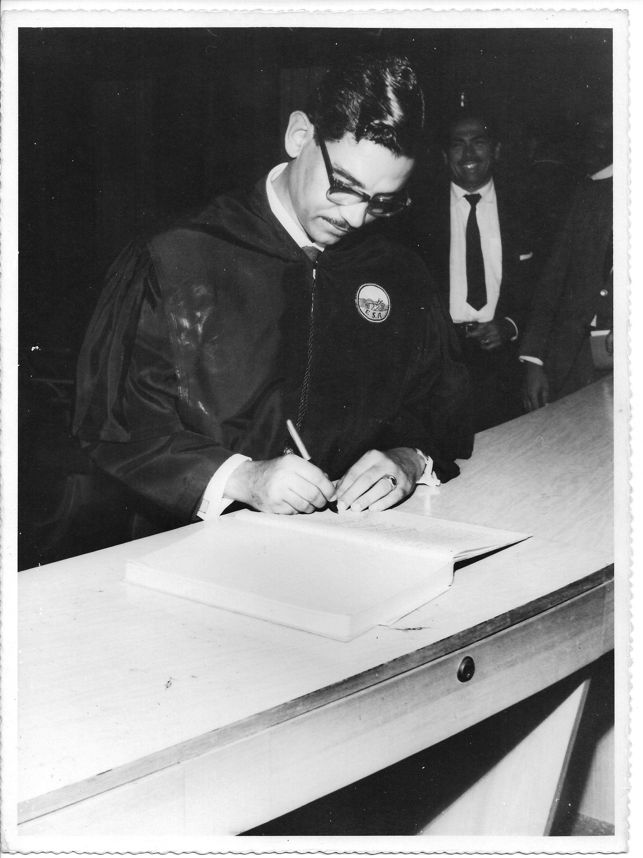 Registra o Professor Adierson Erasmo de Azevedo durante a assinatura no Livro de Atas do Conselho Universitário momentos antes da solenidade de sua posse como Reitor da UFRPE no Salão Nobre da UFRPE, às 10h do dia 13 de novembro de 1963. De pé, veste a beca, veste talar ou traje oficial próprio da vestimenta do Conselho Universitário, usado pelos conselheiros nas solenidades oficiais. Vendo-se ao fundo, o Professor Espedito Meira Couceiro demonstrando sua satisfação num largo sorriso. FONTES DE PESQUISA: Entrevista concedida às bibliotecárias Conceição Martins e Vania Ferreira para atender aos objetivos do Repositório Institucional, projeto “(Re) Memórias da UFRPE”, para a contextualização das imagens do acervo fotográfico do reitorado do Prof. Dr. Adierson Erasmo de Azevedo, no período de dezembro de 1969 a agosto de 1973, localizado no Núcleo do Conhecimento e da Memória Agronômica “Professor João Baptista Oliveira dos Santos”, da Biblioteca Central da UFRPE. Entrevista realizada no dia 13 de abril de 2016, no Espaço Santander da Biblioteca Central da UFRPE. Duração de 2h40min com transcrição e pesquisa complementar da bibliotecária Conceição Martins; Plaquete Mérito Agronômico 2004. Recife: APCA, 2004. 98 p.; AZEVEDO, Adierson Erasmo de. A “caminhada seguindo o sol” da Universidade Federal Rural de Pernambuco. Recife: EDUFERPE, 2007. 147 p. GOMES, Simone. Cerimonial da UFRPE. Depoimento oral concedido à bibliotecária Conceição Martins em 20 de abril de 2016.