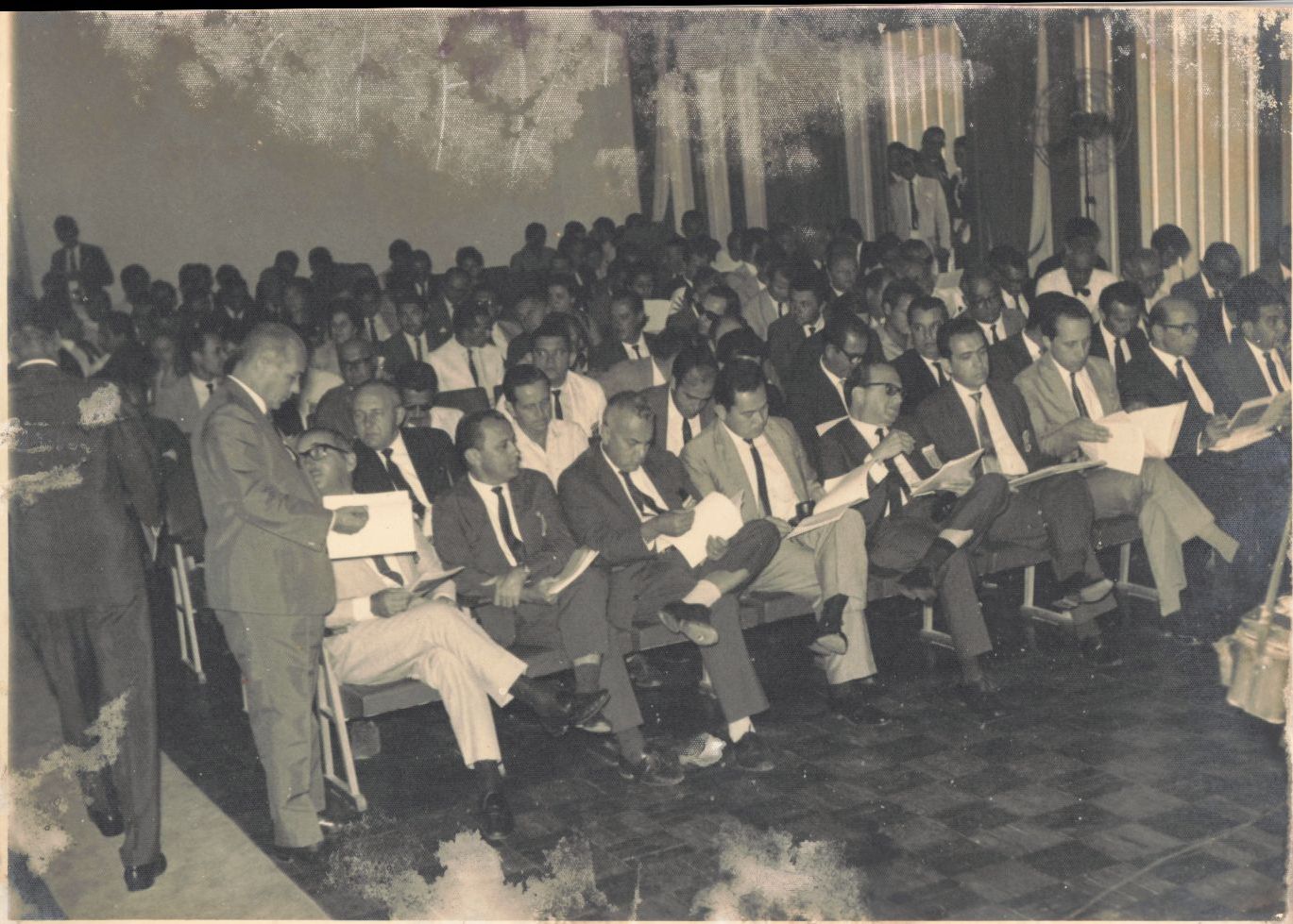 UNIVERSIDADE FEDERAL RURAL DE PERNAMBUCO. Participantes do Congresso Brasileiro de Agronomia realizado no salão nobre da UFRPE, 1968.realizada no salão nobre da UFRPE. Fotografia em preto e branco, revelada em papel fosco, em sépia, 24 cm x 18 cm.