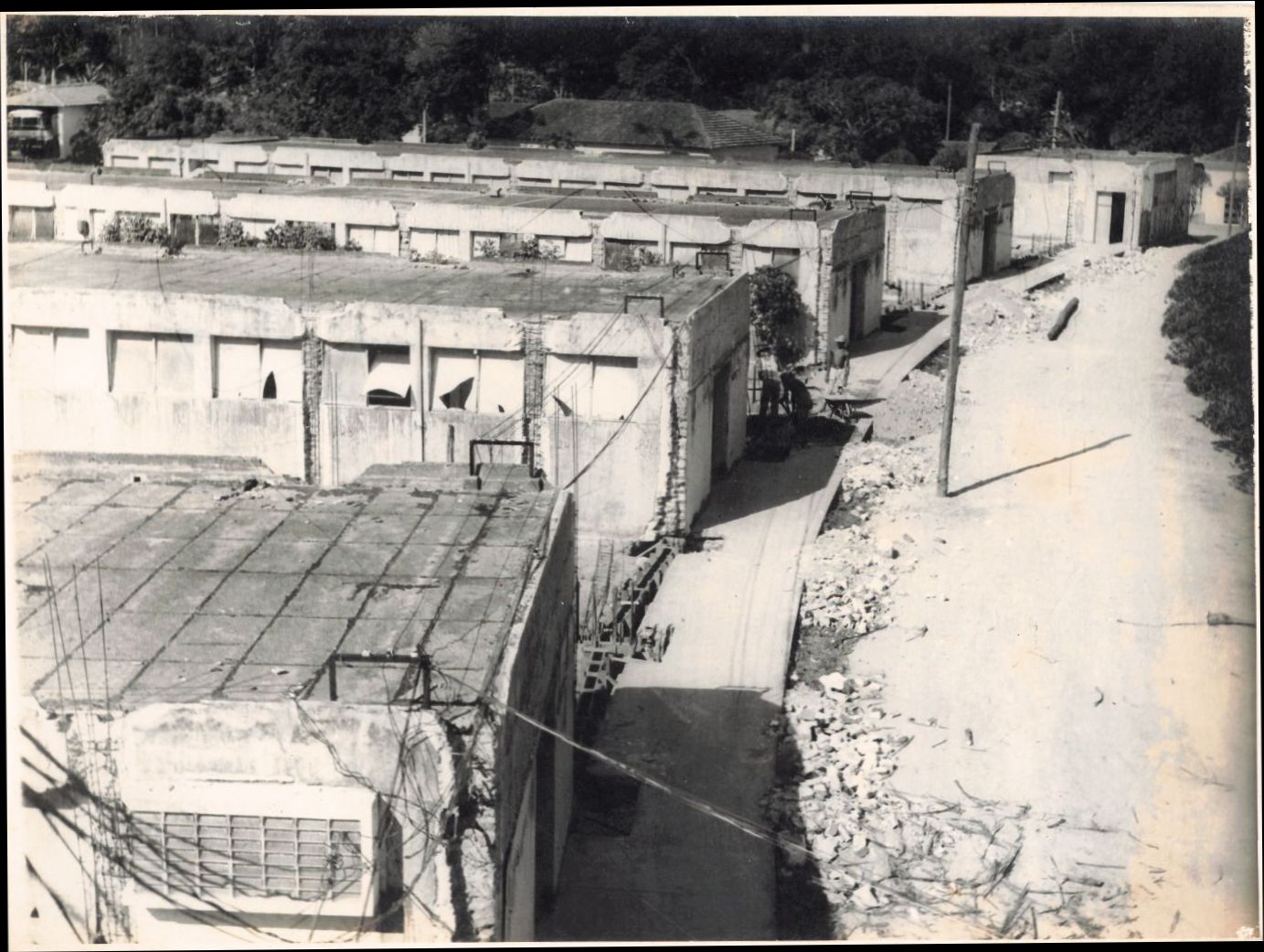 Registro da Reforma, ampliação e reforço dos alicerces dos blocos laterais que compõem a ala esquerda do conjunto arquitetônico da Reitoria da UFRPE. Observa-se que o fotógrafo fez a imagem estando no alto do primeiro andar do bloco central do conjunto arquitetônico, vendo-se os mencionados blocos em plena fase da construção. Vê-se no segundo bloco, dois trabalhadores em sua labuta diária, vê-se também as ferragens, e os restos de materiais na frente do conjunto de blocos. Nota importante: Ao longo das décadas, os reitores mantiveram o compromisso de conservação e manutenção da coerência original com o projeto do arquiteto Luiz Nunes no governo do interventor Carlos de Lima Cavalcanti. Tal cuidado e preservação justificaram que esse conjunto arquitetônico viesse a se tornar um Imóvel Especial de Preservação (IEP), ocupando o nº 80, constante do Anexo I da Lei Ordinária nº 16.159 de 24 de janeiro de 1996 da Prefeitura Municipal do Recife. FONTES DE PESQUISA: PINTO, Waldecy Fernandes. Professor e Reitor da UFRPE no período de 1983-1987. Entrevistas concedidas à Conceição Martins e Maria do Rosário de Fátima Andrade Leitão, em 07 de julho e 15 de outubro de 2009; PRÉDIO Reitoria da UFRPE: resgate histórico 1935-2009. Recife: EDUFRPE, 2011. PESQUISA COMPLEMENTAR: GURAN, Milton. Documentação fotográfica e pesquisa científica: notas e reflexões. Prêmio Funarte Marc Ferrez de Fotografia 2012. Disponível em: http://www.labhoi.uff.br/sites/default/files/doc_foto_pq.versao_final_27_dez.pdf Acesso em: 21 dez. 2023; PISANESCHI, PISANESCHI, Lucilene Schunck C.; BAUER, Viviane Freitas Carlos. A imagem da história: o uso da documentação iconográfica e historiográfica. São Paulo: Amazon & Independently published, 2021.