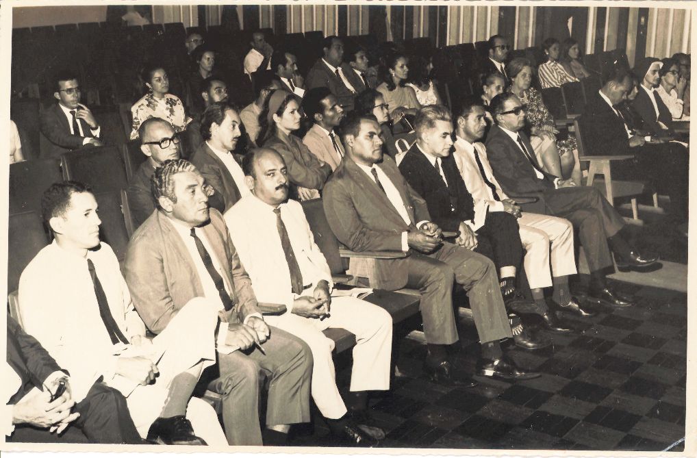 Registra uma reunião de religiosos realizada no salão nobre da UFRPE. Como essa fotografia não possui uma data especificada, adotamos o ano de 1971 como a data em que foi registrada. Nessa fotografia, observa-se a presença de Marclínio Tavares, José de Souto Lima Filho, professor João Lins, Maria de Lourdes Penantes Neves e Eliane Apolinário. Vê-se na primeira fileira do lado direito da fotografia, a presença de uma freira devidamente paramentada. Observa-se também a presença de algumas mulheres dispersas no salão. Durante a entrevista para rememoração, ao observar a fotografia, o reitor Adierson falou: “Observando... Eliane Apolinário já faleceu... (Continua observando) ... Infelizmente não dá para identificar ninguém... é uma pena... (Triste).” FONTES DE PESQUISA: Entrevista concedida às bibliotecárias Conceição Martins e Vania Ferreira para atender aos objetivos do Repositório Institucional, projeto “(Re) Memórias da UFRPE”, para a contextualização das imagens do acervo fotográfico do reitorado do Prof. Dr. Adierson Erasmo de Azevedo, no período de dezembro de 1969 a agosto de 1973. Acervo localizado no Núcleo do Conhecimento Professor João Baptista Oliveira dos Santos da Biblioteca Central., da Biblioteca Central da UFRPE. Entrevista realizada no dia 29 de abril de 2016, no Espaço Santander da Biblioteca Central da UFRPE. Duração de 2h24min com transcrição da bibliotecária Conceição Martins.