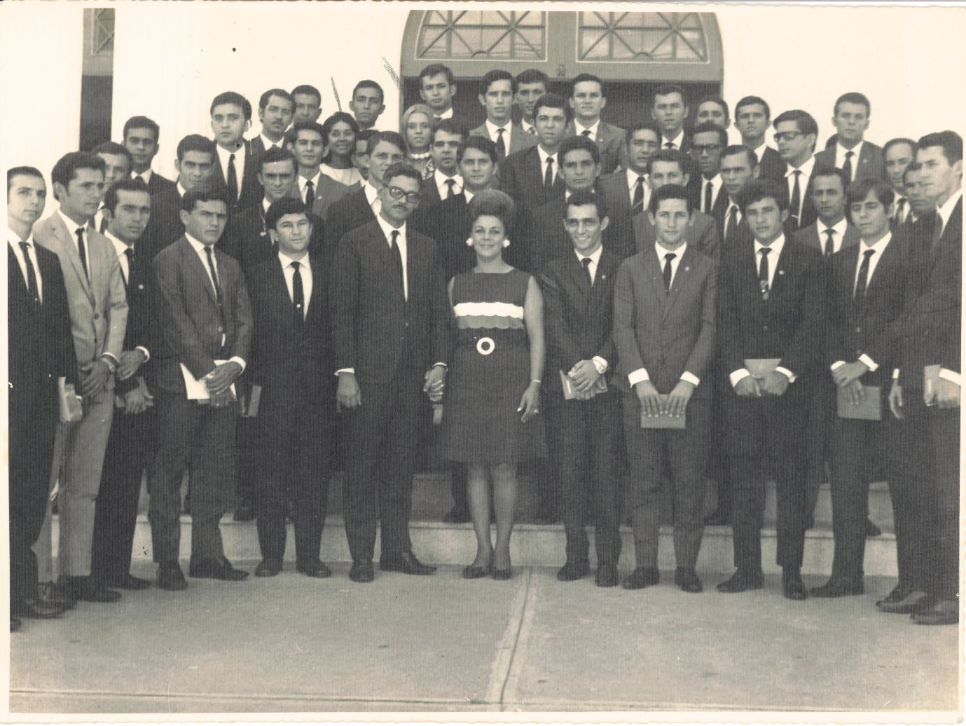 Fotografia da turma de formandos do curso de Agronomia do ano de 1969, vendo-se no centro o professor Adierson Erasmo de Azevedo, reitor da UFRPE, ao lado da senhora Líbia Azevedo, sua esposa e madrinha da turma, ambos ladeados pelos os alunos concluintes de 1969, cuja turma foi composta por 62 alunos, sendo 60 homens e 02 mulheres, assim relacionados: Alfredo Oliveira da Costa Soares, Amílcar de Oliveira Bezerra, Antônio Maria Gomes de Castro, Augusto César de Oliveira, Auryno Rodrigues Brasil, Bayron Rubem Marinho Coelho, Carlos Alberto Borba Schuller, Carlos Alberto Martorelli, Carlos Batista Dertli, Carlos Frederico Tenório de Siqueira, Carlos Roberto Soares de Melo, Celso Franca Ribeiro dos Anjos, Denilson Costa Amorim, Edson Calado Porto, Edson de Abreu Quintela, Edson de Melo Castanha, Eleutério Pereira de Almeida, Eraldo de Abreu Quintela, Fabiano Antônio Marques Guedes da Paz, Fernando Jansen de Almeida Castanha, Fernando Rodrigues dos Santos, Francisco Ribeiro Beltrão, Gabriel Silveira Arruda, George Almério Alves, Geraldo Aguiar Leite, Geraldo Porfírio Pessoa, João Gomes de Moura, João Isaac de Miranda Rocha, João Monteiro Malheiros Júnior, João Pires da Rocha Filho, João Vilmar de Azevedo, José Anselmo Goes, José Célio Araújo, José Edvalson da Silva, José Ferreira de Lima, José Francisco Ramos, José Gaspar Victor da Silva, José Marcelo Luna Martorelli, José Marcolino Edilmar, José Ranulfo da Costa Queiroz Neto, José Soares da Silva Neto, Josué Rodrigues de Moraes, Ladjane Connoly, Lee Roy Lewely Gillesoie Mcfarland, Lourival José de Freitas, Luiz Gonzaga Primo, Manoel Olímpio de Vasconcelos Neto, Marcelo de Almeida Menezes, Márcio Bartolomeu Alves Filho, Marcondes Maurício de Albuquerque, Marconi Flavio de Queiroz, Marcos Aurélio Cavalcanti dos Santos, Marcônio Alexandre Japiassu, Marlene Félix da Silva, Maurício de Azevedo Gomes, Nilton Correia de Azevedo, Pedro Rodolfo Filho, Petrúcio de Lemos Antunes, Raimundo Nonato Siqueira, Raimundo Jerônimo Pereira Rêgo, Rildo Sartori Barbosa Coêlho e Rivaldo Alves Rodrigues, Tales Wanderley Vital e Yony Valadares de Sá Barreto Sampaio. Durante a entrevista para rememoração, o reitor Adierson falou: “Foi da turma de 69... Aqui temos Yony Sampaio eu não vou lembrar os nomes de todos porque foi uma turma grande... Aqui está minha esposa, eu e essa cambada toda de Agronomia!... (Observando)... Em 69, fui eleito por unanimidade por essa turma para paraninfo... Foi uma das grandes alegrias da minha vida como professor! (risos!).” FONTES DE PESQUISA: Entrevista concedida às bibliotecárias Conceição Martins e Vania Ferreira para atender aos objetivos do Repositório Institucional, projeto “(Re) Memórias da UFRPE”, para a contextualização das imagens do acervo fotográfico do reitorado do Prof. Dr. Adierson Erasmo de Azevedo, no período de dezembro de 1969 a agosto de 1973. Acervo localizado no Núcleo do Conhecimento Professor João Baptista Oliveira dos Santos, da Biblioteca Central da UFRPE. Entrevista realizada no dia 27 de abril de 2016, no Espaço Santander da Biblioteca Central da UFRPE. Duração de 2h17min com transcrição e pesquisa complementar da bibliotecária Conceição Martins: Universidade Federal Rural de Pernambuco. Plaquete 80 anos dos cursos de ciências agrárias: UFRPE 1912-1992. p. 59-60.