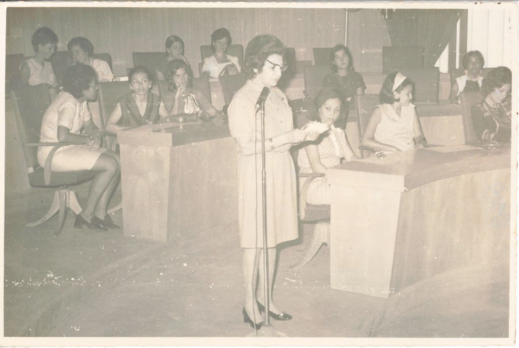 Registra uma atividade acadêmica realizada no salão nobre da UFRPE. Como essa fotografia não possui uma data especificada, adotamos o ano de 1971 como a data em que foi registrada. Observa-se que nas cadeiras onde comumente se acomodam os membros dos Conselhos Superiores da Universidade, encontram-se sentadas 12 figuras femininas, infelizmente, não identificadas. Em destaque há uma senhora diante do microfone discursando ou fazendo uma leitura, também não identificada. Durante a entrevista para rememoração, ao observar a fotografia, o reitor Adierson falou: “ (Observando) ... aqui está difícil lembrar.... Dá para identificar o salão nobre.... Oh! Veja só tem mulheres.... É bem capaz de haver sido uma atividade do Curso de Economia Doméstica... As professoras de lá eram bem dinâmicas... Era alguma atividade de interesse feminino... (Olhando...) ... Pena que não ficou registrado no verso e não consigo lembrar quem era essa senhora que está diante do microfone. ” FONTES DE PESQUISA: Entrevista concedida às bibliotecárias Conceição Martins e Vania Ferreira para atender aos objetivos do Repositório Institucional, projeto “(Re) Memórias da UFRPE”, para a contextualização das imagens do acervo fotográfico do reitorado do Prof. Dr. Adierson Erasmo de Azevedo, no período de dezembro de 1969 a agosto de 1973. Acervo localizado no Núcleo do Conhecimento Professor João Baptista Oliveira dos Santos, da Biblioteca Central da UFRPE. Entrevista realizada no dia 29 de abril de 2016, no Espaço Santander da Biblioteca Central da UFRPE. Duração de 2h24min com transcrição da bibliotecária Conceição Martins.