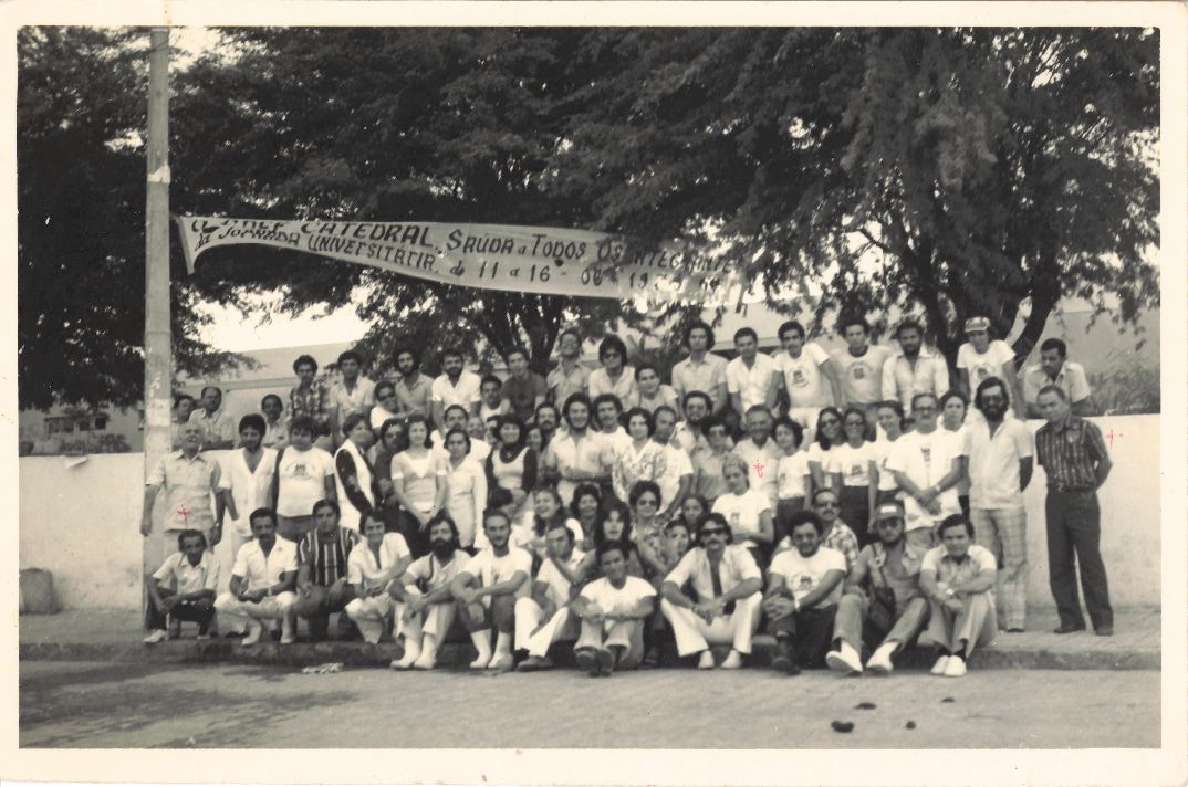 Eis mais uma Jornada Universitária e o momento em que a equipe que a integrou posou para a fotografia que registrou para a posteridade. Como não possui uma data especificada adotamos o ano de 1971 como a data em que foi registrada. Apesar da faixa que saúda os membros da UFRPE, a ação do vento a movimentou, não sendo possível identificar o município no qual se realizou e, apesar de mostrar os dias – de 11 a 16 -, ocultou o mês e o ano do evento. Vê-se os 69 integrantes dessa jornada universitária composta por professores, técnicos, estudantes e pelos motoristas que os transportavam posando para câmera fotográfica. Durante a entrevista para rememoração, ao observar a fotografia, o reitor Adierson falou: “Muito lembrar as Jornadas Universitárias... Era sempre bom observar a alegria e o entusiasmo dos jovens que delas participavam... Não consigo relembrar os nomes de todos... Vamos tentar (Observando)... Olha aqui o Luiz Buraco, um dos motoristas... O professor Cristovam Colombo de Souza... É uma pena, mas a memória não ajuda. Mesmo assim é muito bom rever essa juventude!”. FONTES DE PESQUISA: Entrevista concedida às bibliotecárias Conceição Martins e Vania Ferreira para atender aos objetivos do Repositório Institucional, projeto “(Re) Memórias da UFRPE”, para a contextualização das imagens do acervo fotográfico do reitorado do Prof. Dr. Adierson Erasmo de Azevedo, no período de dezembro de 1969 a agosto de 1973. Acervo localizado no Núcleo do Conhecimento Professor João Baptista Oliveira dos Santos , da Biblioteca Central da UFRPE. Entrevista realizada no dia 04 de maio de 2016, no setor de Normalização da Biblioteca Central da UFRPE. Duração de 2h32min22seg, com transcrição e pesquisa complementar da bibliotecária Conceição Martins.