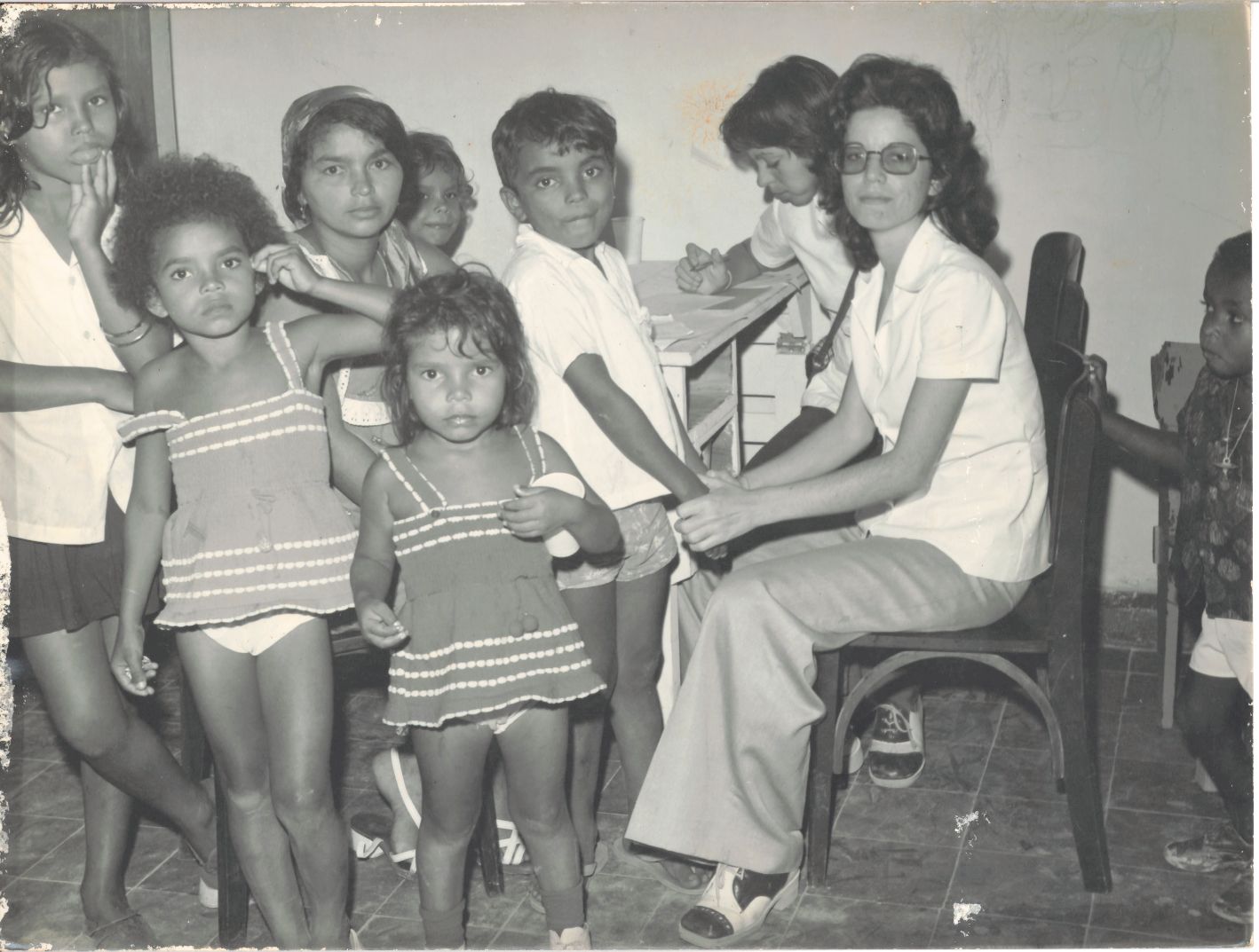 Registra a ação social na área da Pediatria realizada durante a Jornada Universitária de Salgueiro, Pernambuco. Como não possui uma data especificada adotamos o ano de 1971 como a data em que foi registrada.A fotografia apresenta a pediatra em atendimento a um grupo de 07 crianças. Durante a entrevista para rememoração, ao observar a fotografia, o reitor Adierson falou: “Isso, mais uma realização da Jornada Universitária levando a UFRPE à sociedade com ações sociais”. FONTES DE PESQUISA: Entrevista concedida às bibliotecárias Conceição Martins e Vania Ferreira para atender aos objetivos do Repositório Institucional, projeto “(Re) Memórias da UFRPE”, para a contextualização das imagens do acervo fotográfico do reitorado do Prof. Dr. Adierson Erasmo de Azevedo, no período de dezembro de 1969 a agosto de 1973. Acervo localizado no Núcleo do Conhecimento Professor João Baptista Oliveira dos Santos, da Biblioteca Central da UFRPE. Entrevista realizada no dia 04 de maio de 2016, no setor de Normalização da Biblioteca Central da UFRPE. Duração de 2h32min22seg. com transcrição e pesquisa complementar da bibliotecária Conceição Martins.