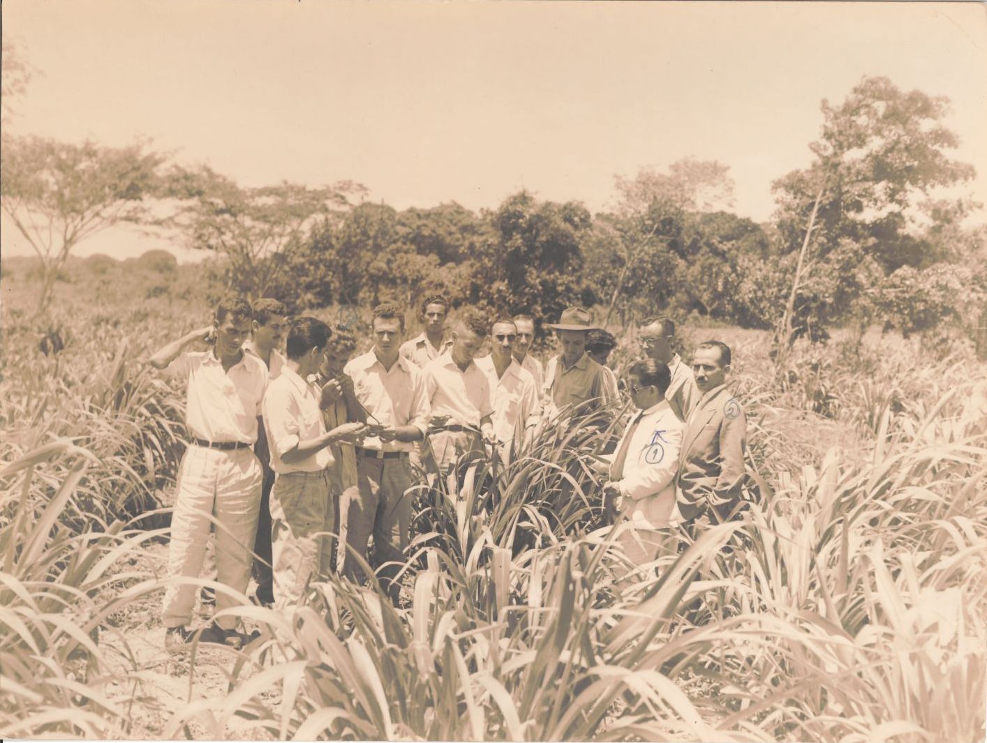 Revela um grupo de alunos do Curso de Zootecnia durante uma aula prática ministrada pelo professor Vicente Camacho de Lacerda o qual encontra-se no ângulo direito da fotografia, trajando terno branco, camisa branca, gravata de cor, usando óculos. Como não possui uma data especificada adotou-se o ano de 1960 como a data em que foi registrada. Da mesma forma, também não foi identificado o local onde ocorreu o registro fotográfico, bem como os nomes dos alunos. FONTES DE PESQUISA: UNIVERSIDADE RURAL DE PERNAMBUCO. Plaquete oitenta anos dos cursos das Ciências Agrárias: 1912-1992. Recife: Imprensa Universitária URP, 1994. PESQUISA COMPLEMENTAR: KOSSOY, Bóris. A fotografia como fonte histórica: introdução à fotografia e interpretação das imagens do passado. São Paulo: Museu da Indústria, Comércio e Tecnologia, 1980.
