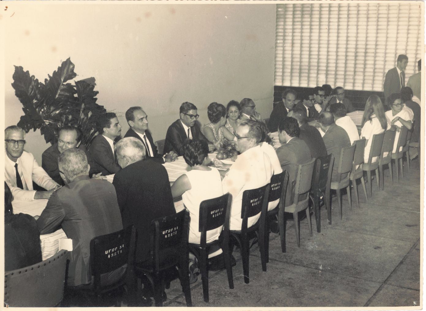 Assinala o almoço de confraternização realizado na UFRPE, como não apresenta a data especificada, determinou-se o ano de 1971 como a data prevista. Sentados à mesa, o professor Adierson Erasmo de Azevedo, reitor da UFRPE, e sua esposa, acompanhados por 26 componentes da universidade, professores: Evaldo Cirne de Azevedo, Humberto Carneiro (de costas), José Torres Pires, Luiz de Melo Amorim, Pedro Correia de Oliveira Andrade, Hermano da Silva Castro, José Henrique Pinto da Carvalheira, Júlio Fernandes, Luiz Geraldo Araújo, Antônio Gondim Lóssio, Cláudio Martiniano Ferreira Selva, Eliane, Edward Robson Cavalcante, Carlos Alberto Tavares, Merval Rosas e a servidora Lúcia. Participam do almoço, as servidoras Eliane e Lúcia. Observa-se que a mesa está disposta no ambiente da própria universidade, na parede posterior do ângulo esquerdo da fotografia, vê-se uma planta compondo o ambiente. Sobre a mesa, defronte ao reitor, há um arranjo misto composto por flores e frutas. As 13 cadeiras dispostas de frente para o fotógrafo não são possíveis de serem identificadas, contudo, percebe-se que a cadeira na qual está sentado o reitor Adierson integra o grupo de cadeiras que têm um revestimento. Há 06 cadeiras em madeira cujos ocupantes encontram-se de costas para o fotógrafo que apresentam o tombo patrimonial. As outras 07 nas quais os ocupantes também se encontram de costas para a objetiva, também integram o grupo de cadeiras que apresentam revestimento. No ângulo direito superior da fotografia, aparecem 02 homens de pé conversando entre si. Durante a entrevista para rememoração, ao observar a fotografia, o reitor Adierson falou: “Que maravilha... Quanta gente boa reunida... Pena que não lembro o que estávamos comemorando... Você pode ler os nomes dos que estão aqui? Ouvindo os nomes lembro deles, mas nem sempre consigo relacionar às pessoas... Ainda bem que ficou registrado!”. FONTES DE PESQUISA: Entrevista concedida às bibliotecárias Conceição Martins e Vania Ferreira para atender aos objetivos do Repositório Institucional, projeto “(Re) Memórias da UFRPE”, para a contextualização das imagens do acervo fotográfico do reitorado do Prof. Dr. Adierson Erasmo de Azevedo, no período de dezembro de 1969 a agosto de 1973. Acervo localizado no Núcleo do Conhecimento Professor João Baptista Oliveira dos Santos , da Biblioteca Central da UFRPE. Entrevista realizada no dia 04 de maio de 2016, no setor de Normalização da Biblioteca Central da UFRPE. Duração de 2h32min22seg, com transcrição e pesquisa complementar da bibliotecária Conceição Martins.