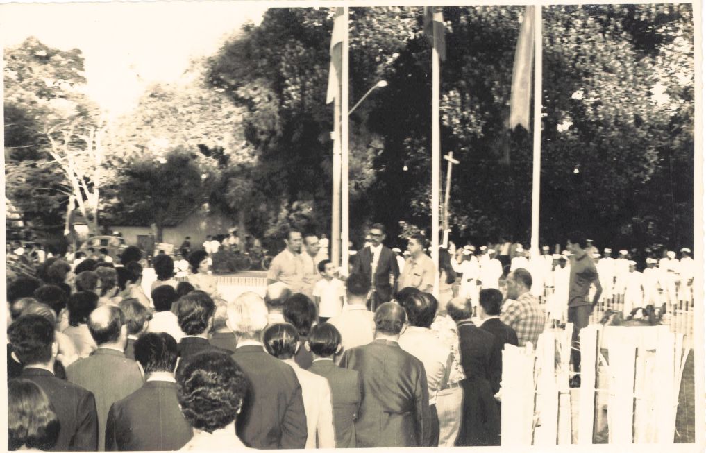 Registra a nona e última fotografia relativa à solenidade de inauguração da Escola Lions Recife Parnamirim, construída com recursos angariados pelo Lions Clube Recife Parnamirim Distrito L14, em terreno cedido pela Universidade Federal Rural de Pernambuco, ocorrida no dia 28 de agosto de 1971. Esta fotografia, retrata o momento em que o professor Adierson Erasmo de Azevedo, reitor da UFRPE, discursava após o hasteamento das bandeiras. Encontram-se ao seu lado o professor Waldecy Fernandes Pinto, docente da UFRPE e membro do Lions Clube Parnamirim, o Dr. Dr. Alfredo Vieira, presidente do Lions Clube de Parnamirim, além de outro professor de nomen não identificado. Vê-se também um garoto olhando o reitor Adierson. Observa-se no entorno grande quantidade de membros do Lions Clube Parnamirim, representantes da UFRPE, a banda dos Aprendizes de Marinheiros e pessoas da comunidade todos presentes no evento. Durante a entrevista para rememoração, ao observar a fotografia, o reitor Adierson falou: “É muito bom olhar para trás e ver minhas pegadas firmes e fortes ao longo da minha vida e os frutos que consegui deixar e estão registrados nessas fotografias... É muito gratificante rever o resultado do que semeei em meu reitorado aqui na UFRPE”. FONTES DE PESQUISA: Entrevista concedida às bibliotecárias Conceição Martins e Vania Ferreira para atender aos objetivos do Repositório Institucional, projeto “(Re) Memórias da UFRPE”, para a contextualização das imagens do acervo fotográfico do reitorado do Prof. Dr. Adierson Erasmo de Azevedo, no período de dezembro de 1969 a agosto de 1973. Acervo localizado no Núcleo do Conhecimento Professor João Baptista Oliveira dos Santos da Biblioteca Central, da Biblioteca Central da UFRPE. Entrevista realizada no dia 04 de maio de 2016, no setor de Normalização da Biblioteca Central da UFRPE. Duração de 2h32min22seg. com transcrição e pesquisa complementar da bibliotecária Conceição Martins.